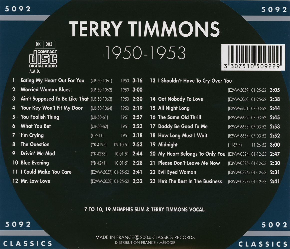 Terry Timmons wurde am 12. April 1927 in Charleston/West Virginia geboren und zog später mit der Familie nach Cleveland/Ohio. Bei dortigen Clubauftritten lernte sie den Bandleader Paul Gayten kennen, der sie als Bandsängerin in der Nachfolge von Annie Laurie anstellte. Die Zusammenarbeit war aber nur kurzzeitig und Terry ging nach Chicago. Dort traf sie auf Memphis Slim, der ihr 1950 einen Vertrag mit Premium Records vermittelte. 1951 wechselte sie zu Victor Records (u.a. 1952 „Got Nobody To Love“ auf 47-4549, „Mr. Low Love“ auf 47-4675, „The Same Old Thrill“ auf 47-4882 und 1953 „He’s The Best In The Business“ auf 47-5224) und sie ging mit Memphis Slim auf Tour.