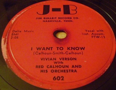 Die erste Veröffentlichung von J-B war mit Country Johnny Mathis "Contented " / "Me For You, You For Me" (J-B 1500). Er hatte unter anderem auch Jimmy Smith mit dem Red Calhoun Orchester in seinem Programm und mit der Nummer 602 gab es "I Want To Know" mit Vivian Verson und "Payday Lover", wo sie Duett-Partnerin von Jimmy Smith war. Weitere Einspielungen von Vivian Verson konnte ich zumindest singlemäßig nirgendwo mehr finden.