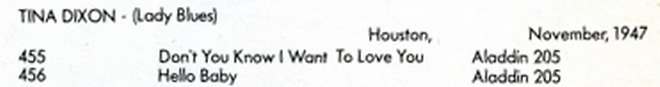 Tina Dixon machte ihre ersten Aufnahmen 1945 gemeinsam mit dem Orchester vin Jimmy Lunceford für AFRS-Jubilee. 1947 wechselte sie für zwei Platten zu King Records (u.a. 1949 „Blow Mr. Be Bop“ auf King 4332) und im selben Jahr für nur eine Scheibe zu Aladdin Records.