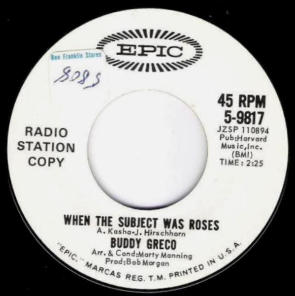 Greco has recorded albums for Columbia, Reprise and Pye his most popular albums were On Stage and Buddy's Back in Town both recorded on Columbia. His most successful single was "The Lady is a Tramp". It sold over one million copies, and was awarded a gold disc. Greco recorded an album entitled Movin' On which included his version of the Marvin Gaye standard "What's Going On". Greco recorded sporadically after this album, but the live shows kept on coming and he has performed in most of the top nightclubs in the world. His last nationally charted record was "From Atlanta to Goodbye" on the Scepter label. It made Billboard's Easy Listening Top 40 in 1969.