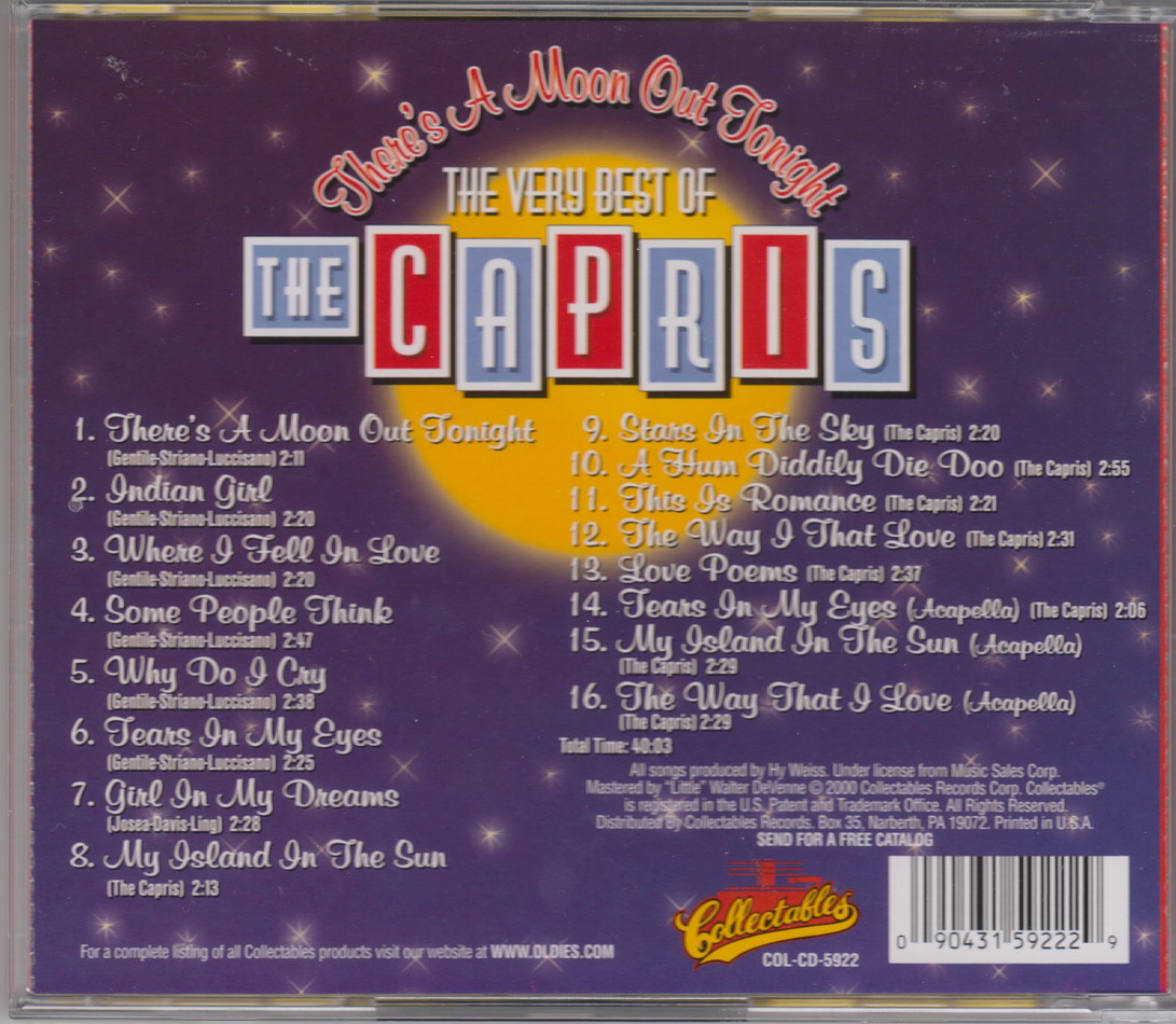 In 1982, Nick Santo rejoined and resurrected the group and they went in to the studio to record a new album, “There's a Moon out Again”, for Ambient Sound (Records). Besides doing covers of some doo wop classics, the Capris also included a couple of original tunes. One of these was a song called "Morse Code of Love." The tune sounded like it came right out of the late '50s, and many thought it was in fact an overlooked "oldie." It was also released as a single in 1982, backed with "There's a Moon out Again." And the song got even more exposure when Manhattan Transfer decided to cover it. Over the years, "Morse Code of Love" has only grown in popularity and has become one of the most requested tunes on oldies-type radio stations. Once again The Capris scored a home run with a 1950s sound that touched the heartstrings of the listeners and evoked the spirit of a time when life was simpler.