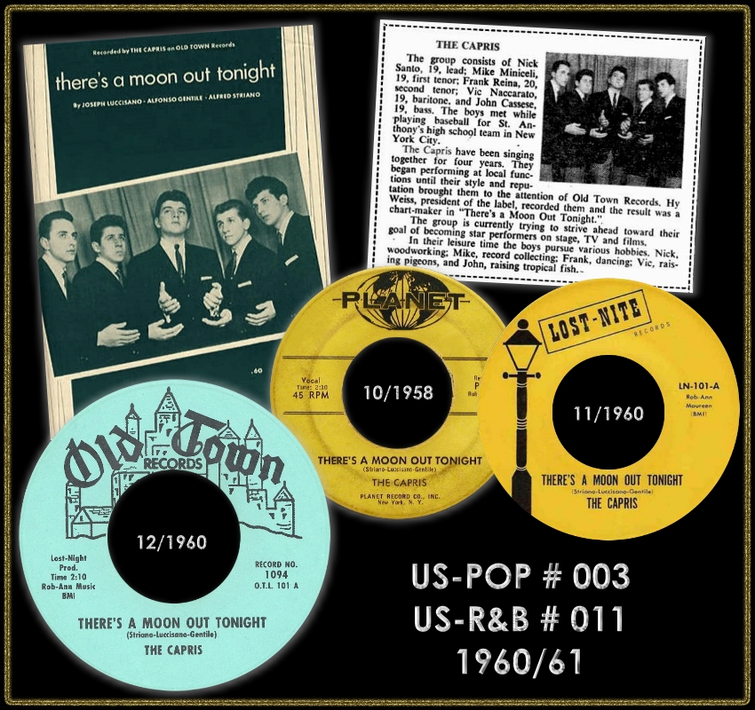 Their song "There's a Moon Out Tonight" ended up in the hands of Murray the K at WINS. He had a show called “Rate the Record”. On the show there five records going up against each other, one of them being, “There’s a Moon Out Tonight” by The Capris. The Capris won one night and came in second to “Will You Love Me Tomorrow,” which was a major hit by The Shirelles. The Capris had all quit their jobs and reunited. A week later they were at the Apollo Theater in Harlem, then at the Brooklyn Paramount, The Regal in Roanoke, Virginia. They were all over the place and were on the rise. No one believed the song could be a hit on Lost Nite, but when Old Town got involved, the record hit the charts in the first week of 1961, and stayed there for 14 weeks.