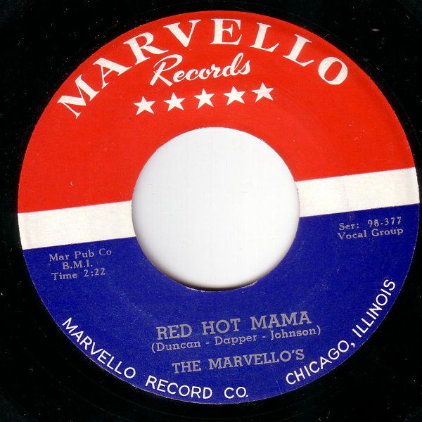Es gab einige Formationen die sich MARVELLOS nannten. Ich möchte hier die MARVELLO'S mit Apostroph vorstellen, weil ihre Aufnahmen mit einem skurillen Hintergrund behaftet sind. Da gibt es einmal das Label MARVELLO das 1961 gegründet wurde und einen Veteranen in der chicagoer Musik-Szene, nämlich James P. Johnson gehörte. Sein A&R-Mann war der Trompeter King Kolax. Die ersten zwei Veröffentlichungen hatten die gleiche Nummer, nur die Matrix-Nummern waren unterschiedlich, diese waren jedoch nur ins "deadwax" geritzt. Außerdem hatten diese Singles nur auf der A-Seite die Marvello's und die Rückseite war jeweils mit Dotty Tillman belegt.