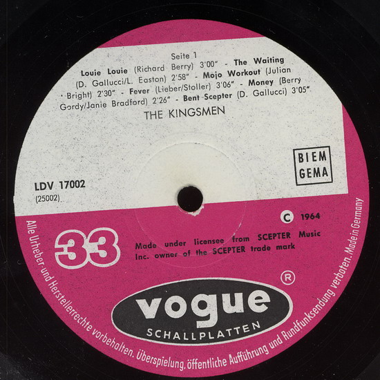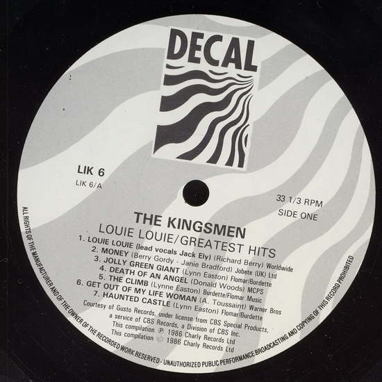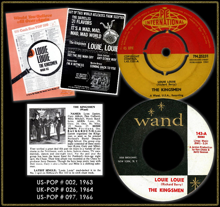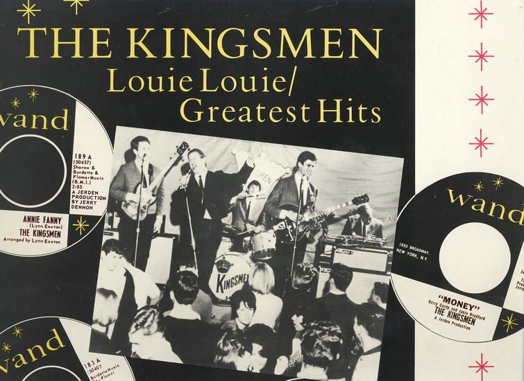 Die Geschichte der 1959 gegründeten Band The Kingsmen lässt sich im Wesentlichen trotz ihres mittlerweile über fünfzigjährigen Bestehens immer noch auf den einen Song herunterbrechen, der mit seinem unwiderstehlich simplen Orgel-Akkord zum Garagenrocksong par excellence werden sollte und der doch nicht einmal von der Band selbst geschrieben worden war: Louie Louie. Die Nummer, in der ein heimkehrender Jamaikaner von der Sehnsucht nach seiner Geliebten singt, hatte der Songwriter Richard Berry im Jahre 1955 als Ballade geschrieben, und der Song war bereits diverse Male neu aufgenommen worden, als sich die Kingsmen 1963 des Stücks annahmen. Diese Garagen-Band, deren Sänger Jack Ely seinerzeit noch nicht einmal dem Stimmbruch entwachsen war, hatte sich als zweiten Song ihrer "Karriere" eben jenes Louie Louie ausgesucht und nahm es in einer recht lärmigen Lo-Fi-Version auf, und auf der Aufnahme sind deutliche Schnitzer in Gesang und instrumentaler Performance zu hören. (Der Schlagzeuger Lynn Easton verlor beispielsweise kurz vor dem Beginn der zweiten Strophe seinen einen Drumstick und ruft deutlich hörbar "Fuck!".) Obwohl die Single von einem Radiosender als "schlechteste Platte der Woche" durch den Kakao gezogen wurde, schoss Louie Louie in der Kingsmen-Version bis auf Platz 2 der Billboard Charts, blieb dort sechs Wochen lang und verkaufte sich insgesamt mehr als eine Million Mal. Die Kingsmen hatten den definitiven Garagen-Klassiker eingespielt.