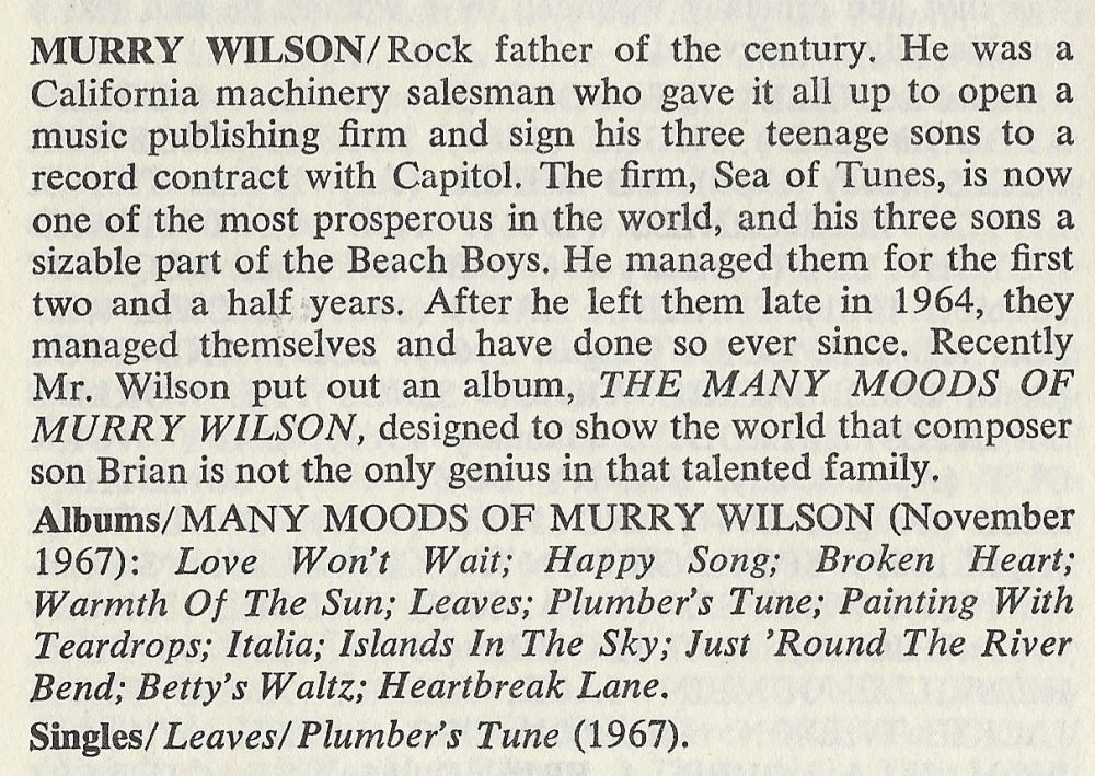 Murry Wilson - der Vater von 3 Beach Boys - und späterer Manager der SUNRAYS, hat auch eine eigene LP aufgenommen. Es ist reine Orchester-Musik - Fahrstuhlmusik wie ein Mitglied des Beach Boys Forums es bezeichnet. Leider steht auch nicht auf der LP, wer die die Mitglieder oder wer das Orchester war.