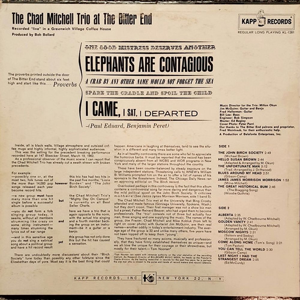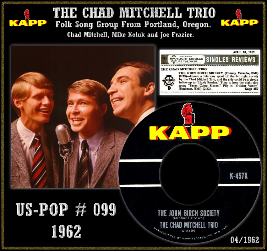 After releasing mostly conventional folk songs, the trio unleashed the then-daring satire "The John Birch Society" (Fighting for the right to fight/The right fight for the Right!), which established their ability to perform more controversial material. Their departure from Belafonte Enterprises in 1962, followed by their move to Mercury Records in 1963, gave them more freedom to add aggressively political songs to their body of folk, love, and world-music songs.