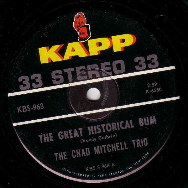 The Trio's first recordings for Colpix were similar to the conventional folk songs that were gaining popularity then as an alternative to the early rock-and-roll genre. It was songs from their first Kapp Records release — "Mighty Day" (about the 1900 Galveston, Texas hurricane); "Rum By Gum" (about the Temperance/Prohibition movement); and, "Lizzie Borden" (an irreverent satire countering the common heroizing of the accused axe murderess) — which began to make the Trio distinct.