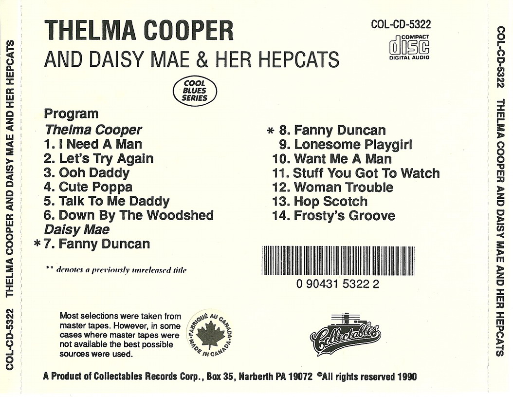 Thelma Cooper lebte mit ziemlicher Sicherheit in Philadelphia, nahm in zwei verschiedenen Sessions vier Titel für Gotham auf und arbeitete auch für die Essex-Tochtergesellschaften Paid und Holiday – wahrscheinlich später. Mit ihren Boy Friends nahm sie Mitte 1949 “Daddy“ und “Cute Poppa“ auf, die Mr. Irin Ballen offenbar so beeindruckten, dass sie noch vor Jahresende zurückkehrte. Ihre Boy Friends sind eine wirklich gute Band, nicht unähnlich denen auf BIG BAND BLUES.