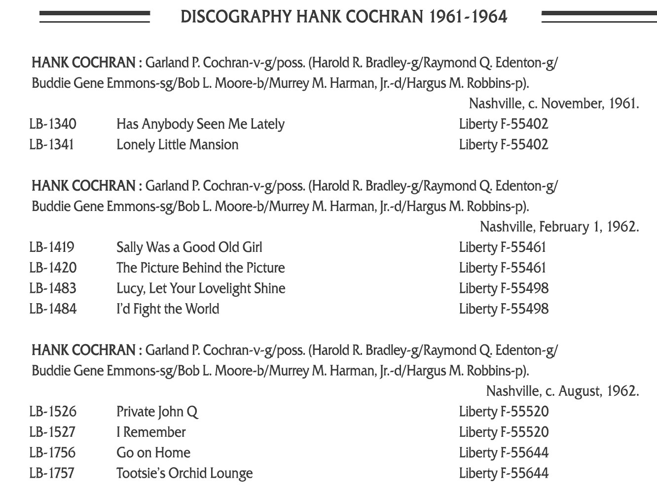 Der Country-Sänger, Gitarrist und Songschreiber Hank Cochran wurde am 2. August 1935 in Isola, Mississippi, als Garland Perry Cochran geboren und verstarb am 15. Juli 2010 in Hendersonville North of Nashville, Tennessee, an Bauchspeicheldrüsen-Krebs.