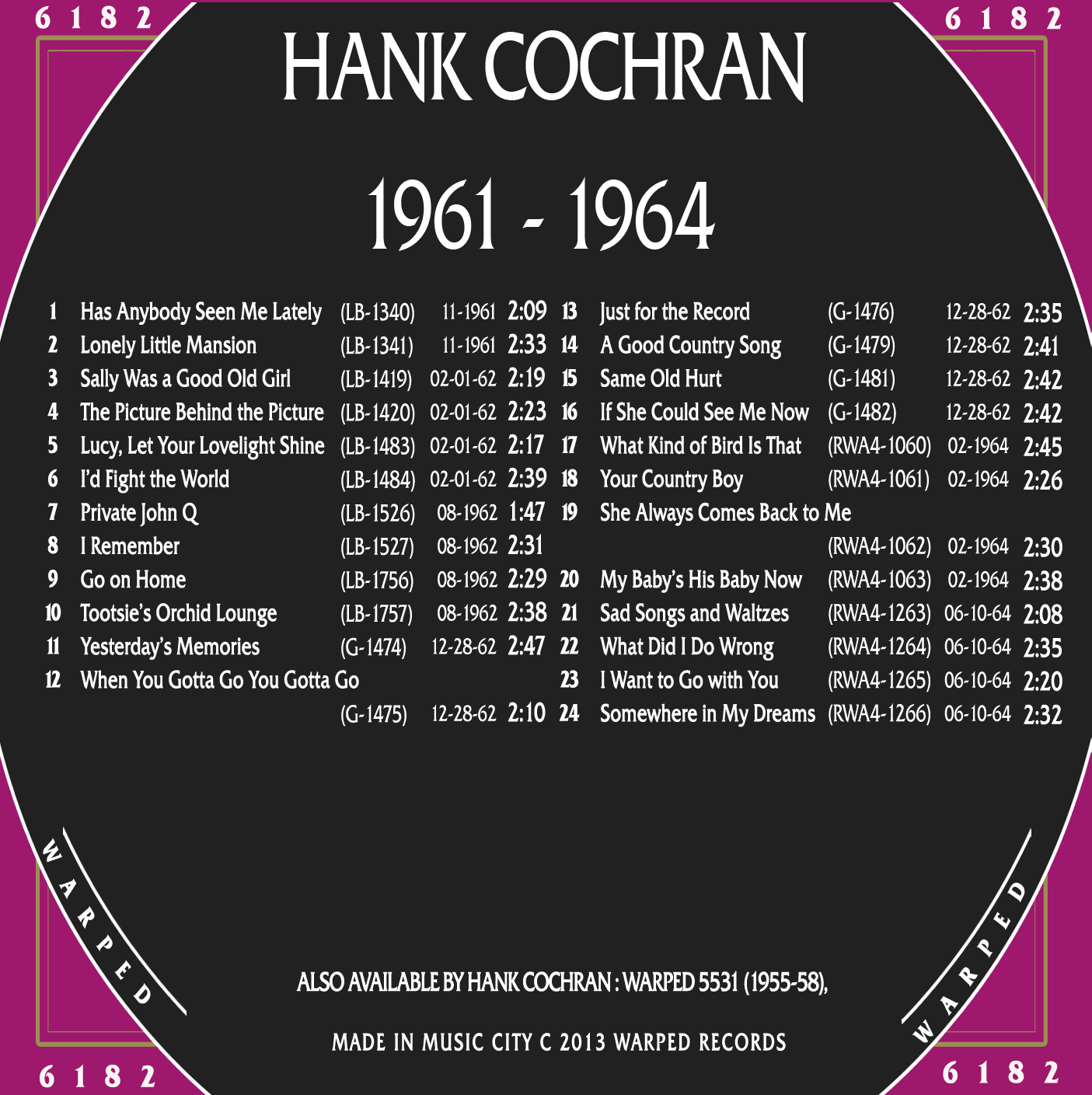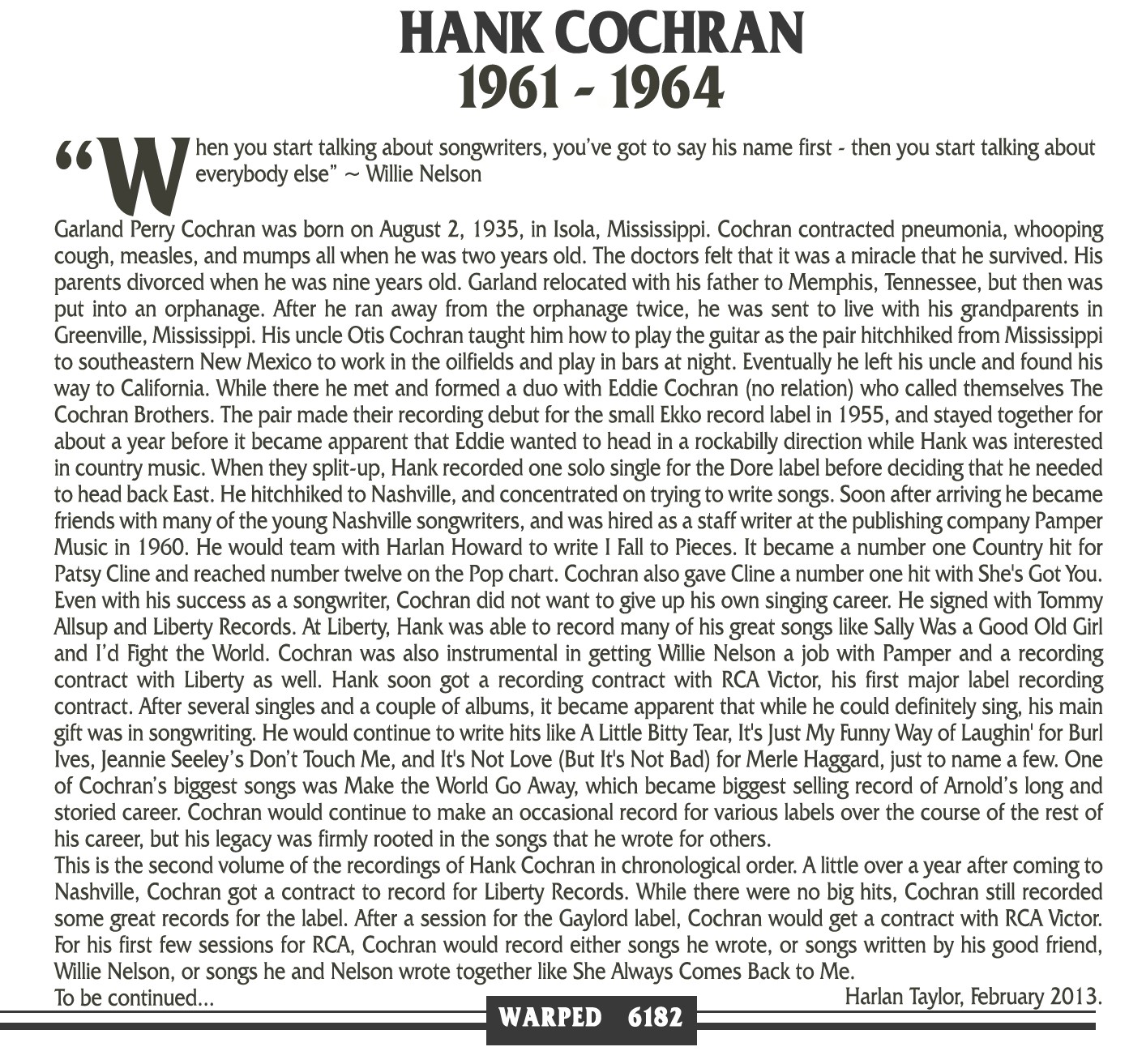 Der Country-Sänger, Gitarrist und Songschreiber Hank Cochran wurde am 2. August 1935 in Isola, Mississippi, als Garland Perry Cochran geboren und verstarb am 15. Juli 2010 in Hendersonville North of Nashville, Tennessee, an Bauchspeicheldrüsen-Krebs.