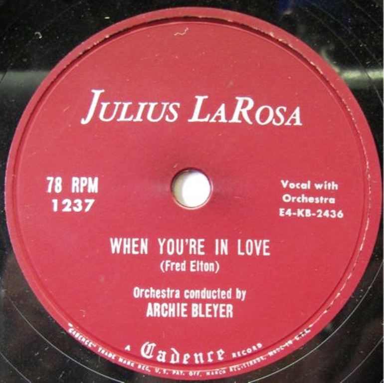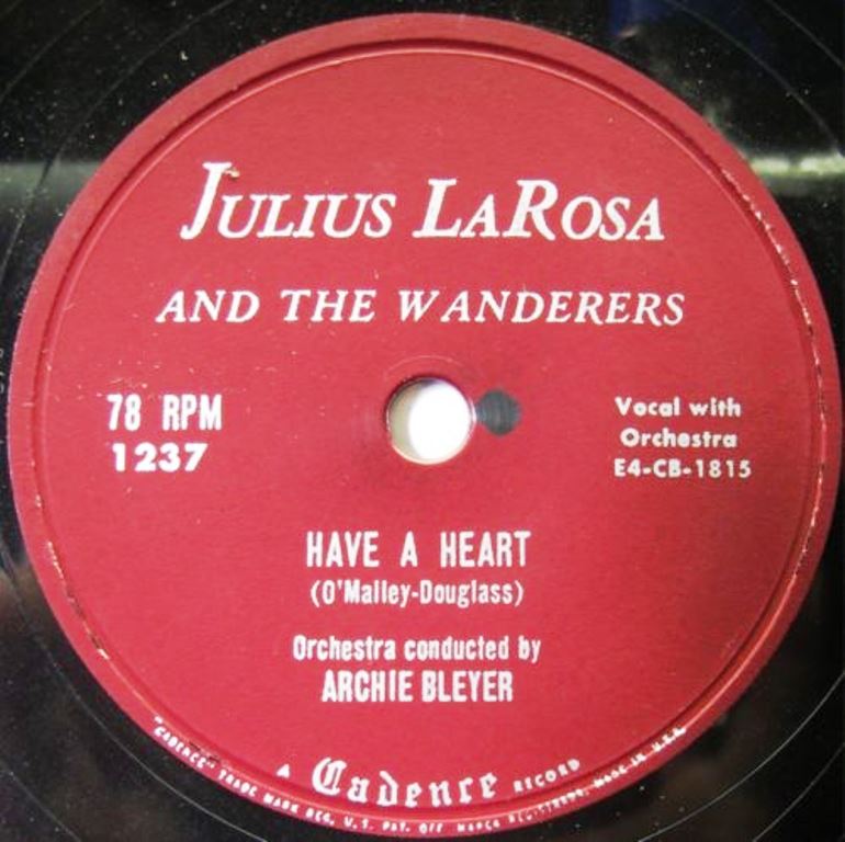 Sein erster Solo-Interpret auf Cadence Records hieß Julius LaRosa (* 02. Januar 1930) (®1951) aus Brooklyn/New York, der seit Anfang 1953 bis zum Frühjahr 1954 die Produktion ausschließlich für sich in Anspruch nahm und gleich mit “Anywhere I Wander“ im Januar 1953 und “Eh Cumpari“ im August 1953 zwei Chart-Erfolge verbuchen konnte. Als LaRosa das Niveau der Anfangserfolge im Laufe der Folgejahre nicht halten konnte, wurde er 1955 kaltgestellt und durch den Sänger Andy Williams ersetzt. Williams startete seit 1956 eine Hitserie und ließ bis Ende 1962 bei Archie Bleyer die Kassen klingeln. La Rosa tröstete sich mit einem Wechsel zu RCA Records und weiteren Hit-Singles in den Jahren 1956/57 u.a. “Mama Guitar“.