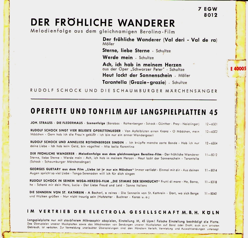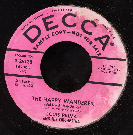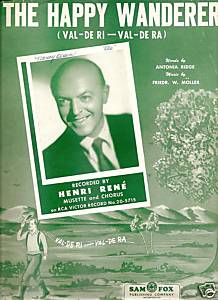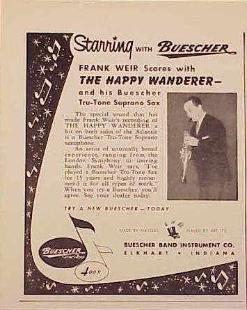 Besonders populär wurde er dann im selben Jahr auf der britischen Insel und in den Staaten mit seiner Version von “The Happy Wanderer (Val-De Ri-Val-De Ra)“, die sich durch seine Sopran-Saxophon-Soli auszeichnete. Das Original hieß “Der Fröhliche Wanderer“ oder “Mein Vater war ein Wandersmann“, eine Komposition von Friedrich-Wilhelm Möller aus der frühen Nachkriegszeit. Möller’s Schwester Edith war damals die Leiterin eines Laien-Kinderchores aus Obernkirchen/Landkreis Schaumburg, berühmt geworden als die Schaumburger Märchensänger. Dieser Chor aus Niedersachsen siegte 1953 bei einem Festival in Wales und wurde mit dem Zugabetitel “Der Fröhliche Wanderer“ gefeiert. Das BBC-Auslandsprogramm übertrug das Konzert und machte das Lied in der englischen Fassung “The Happy Wanderer“ sofort weltweit populär und der Chor schaffte am 23. Januar 1954 als Obernkirchen Children’ Choir den Einstieg in die UK-Chart, erreichte # 2 und hielt sich insgesamt 26 Wochen in der Hitparade. In einer besonderen Punktewertung belegte der Titel # 4 unter den besten 20 des Jahres 1954 und der Chor selbst # 6 unter den 10 besten Artisten. 1955 gipfelte der Erfolg des Titels “Der Fröhliche Wanderer“ in einem deutschen Spielfilm.