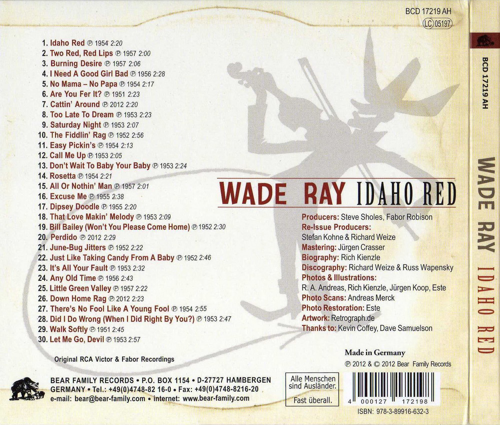 Der Western Swing Fiddler und Sänger Wade Ray wurde am 13. April 1913 in Evansville, Indiana, geboren und verstarb am 11. November 1998 in Sparta, Illinois.