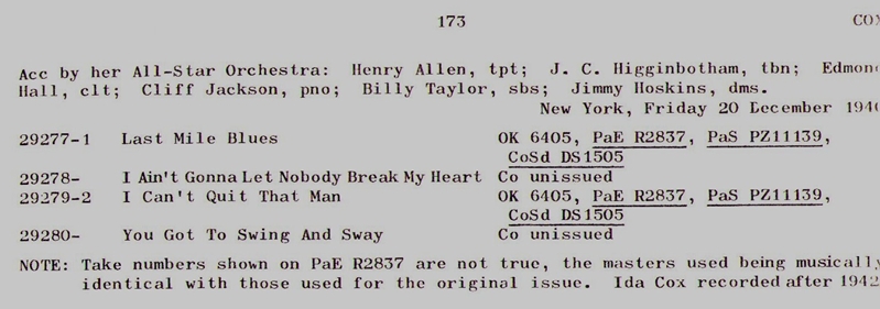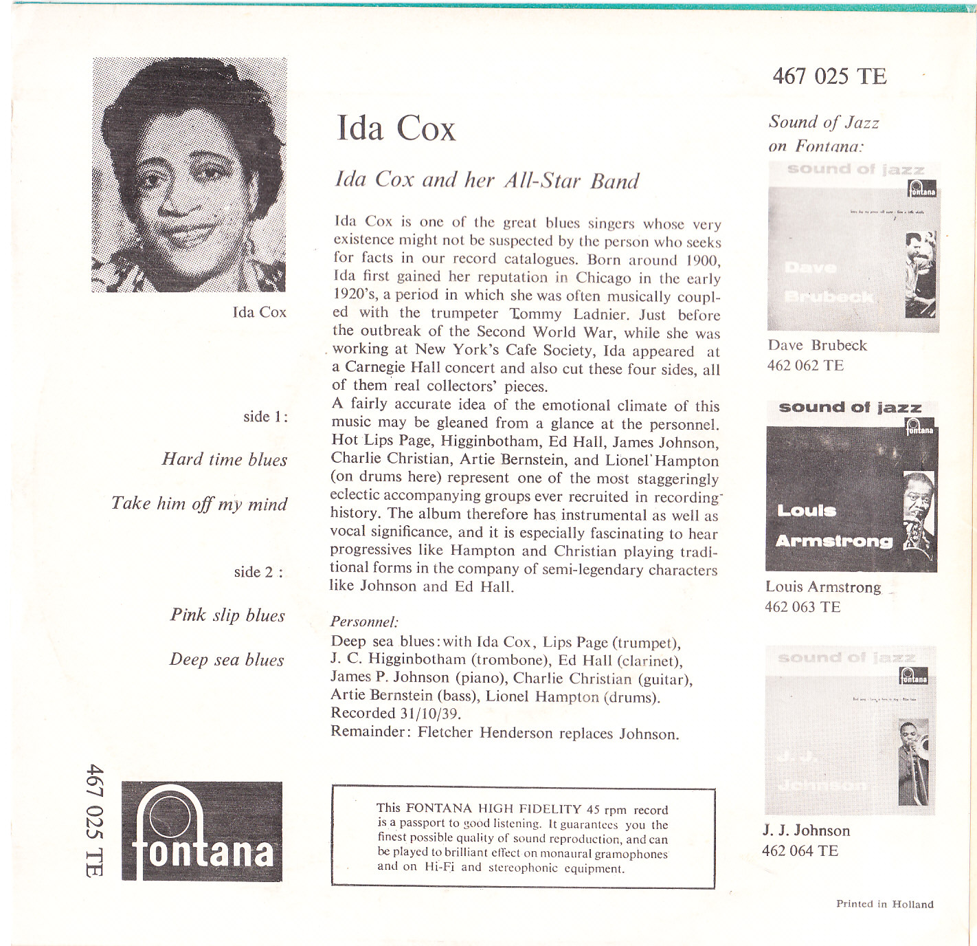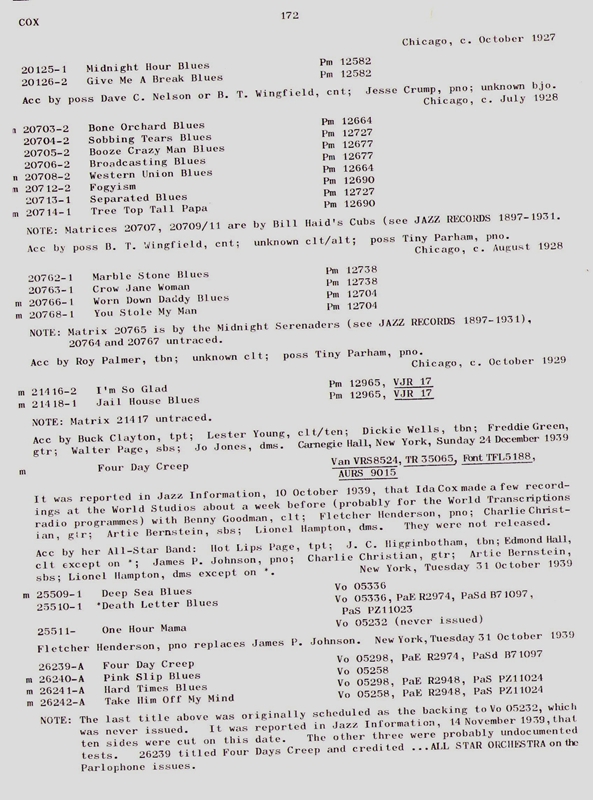 Cox nahm außerdem mit Charlie Christian, Lionel Hampton, J. C. Higginbotham, Jelly Roll Morton, Elmer Chambers und Tommy Ladnier auf.