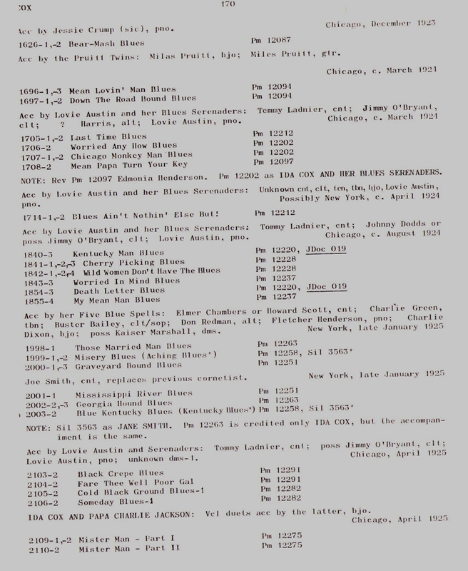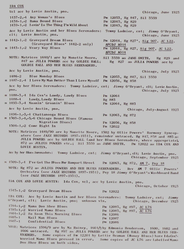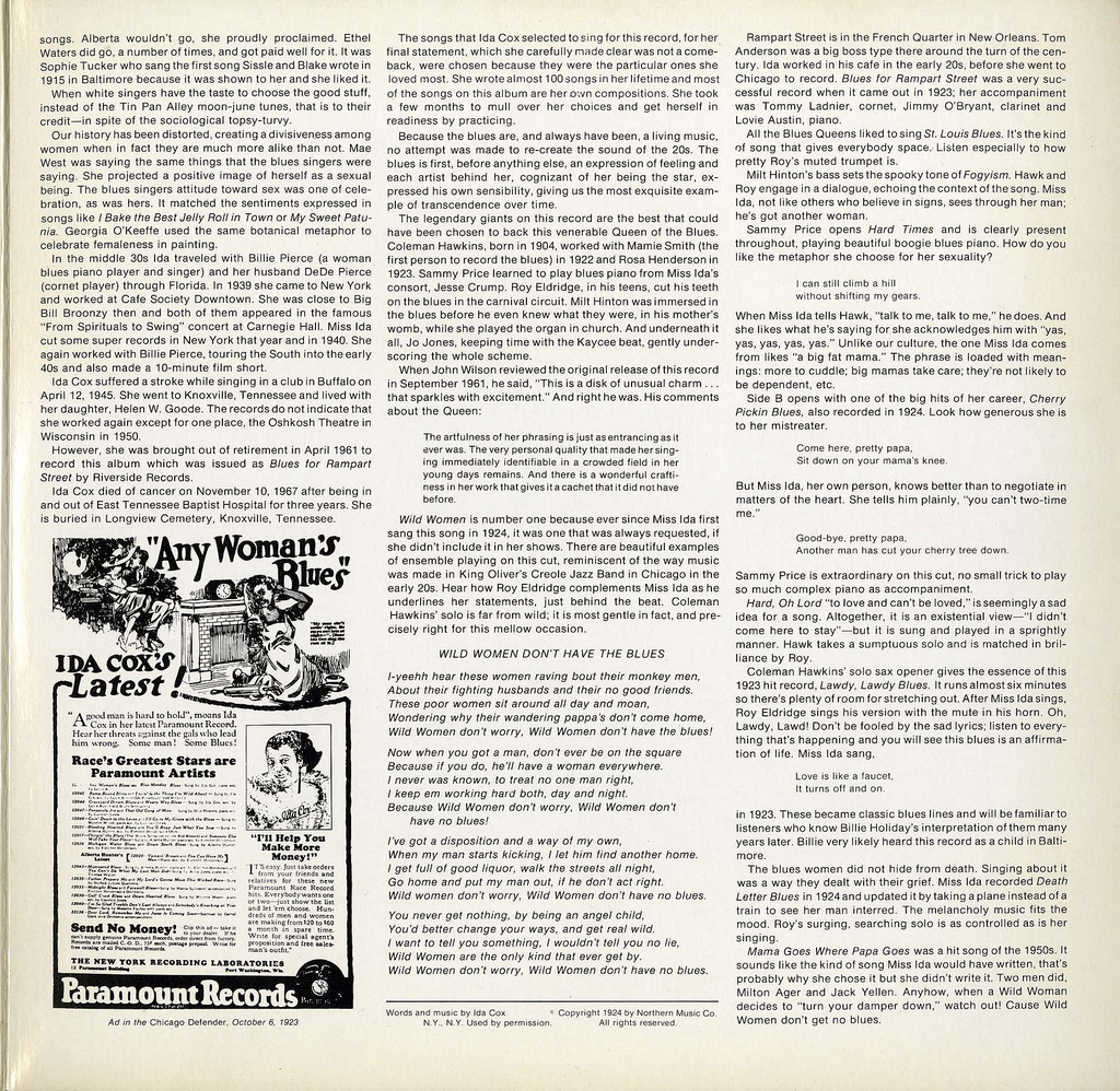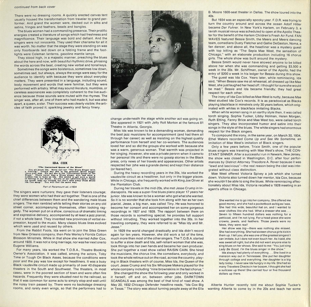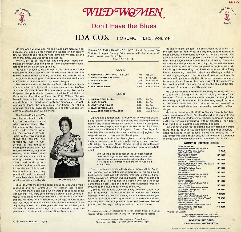 Cox begann als Darstellerin und Sängerin in Minstrel Shows, wechselte dann zum Vaudeville und war zu Beginn der 1920 er Jahre der Star der “Theater Owners Booking Association“. Sie machte makabre Titel mit einprägsamen Namen (“Monkey Man Blues“, “Death Letter Blues“, “Graveyard Bound Blues“) bekannt, behauptete aber auch “Wild Woman Don’t Have the Blues“.
