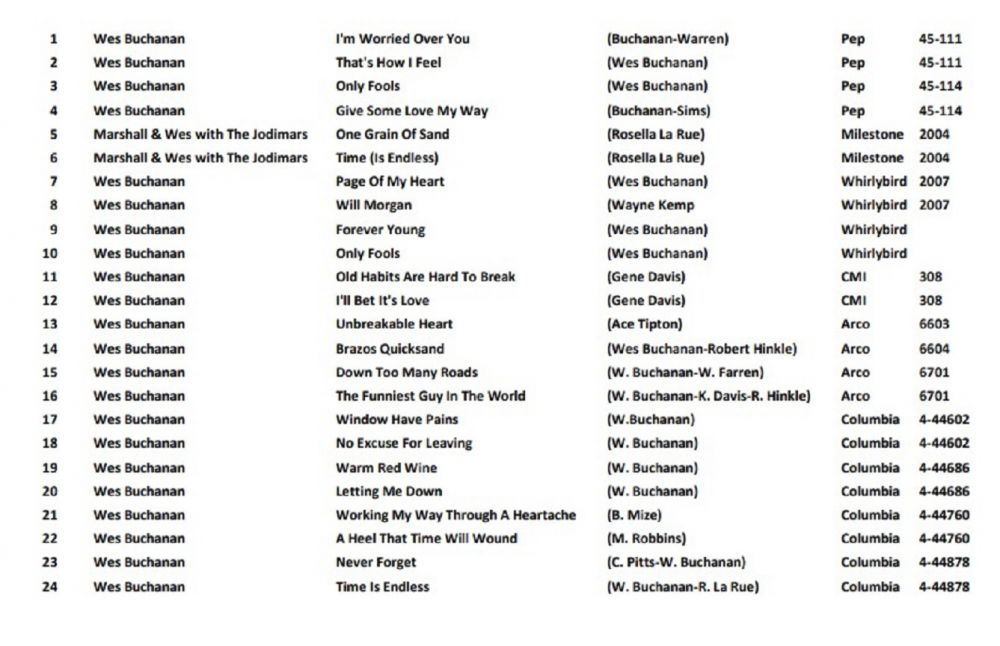 Über Wes Buchanan gibt es auch kaum etwas zu berichten, außer dass er auf PEP zwei Singles veröffentlichte. Die dritte Veröffentlichung erfolgte gemeinsam mit Marshall Lytle und seinen Jodimars. Wes Buchanan starb 1985.