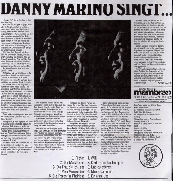 Danny Marino kam am 29. März 1936 als Sohn italienischer Eltern in Tunesien oder Italien, jedenfalls verbrachte er seine Jugend in Tunesien, als Salvatore Mezzasalma zur Welt. Nach seinem 16. Lebensjahr ging er nach Paris, wo er an der Sorbonne Philosophie studierte. Zur Finanzierung des Studiums musizierte er mit einem Freund in Bars und Nachtlokalen. Etwa Mitte der Fünfzigerjahre erhielt seine italienische Tanz-Combo gute Engagement-Angebote aus Hamburg die er sofort annahm. In Hamburg trat er bereits unter seinem Künstlernamen Danny Marino auf. Die Leute von HELIODOR wurden auf ihn aufmerksam und nahmen ihn unter Vertrag. Danach kam METRONOME und ARIOLA. Als Schlagersänger und Chansonnier war er aufgrund seiner Auftritte beliebt und relativ populär, Chart-Erfolge gab es für ihn aber keine. 1962 gründete er mit Bruder Fabio und seiner Frau ein Lokal, welches zu einem bekannten und beliebten Szene-Treff wurde. In den den Siebziger-Jahren ließ der Erfolg bei den Lokalen, es waren inzwischen bereits mehrere, nach und sie mußten sukzessive geschlossen werden. Danach ging er nach Agadir, Marokko, wo er eine Werbeagentur leitet. Bereits von einer Krankheit schwer gezeichnet kam er etwa um 2003 nach Deutschland zurück, wo er am 16. Septemeber 2003 völlig verarmt im Universitätsklinikum Hamburg-Eppendorf verstarb