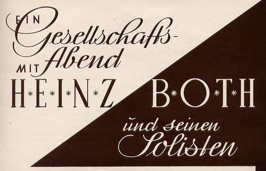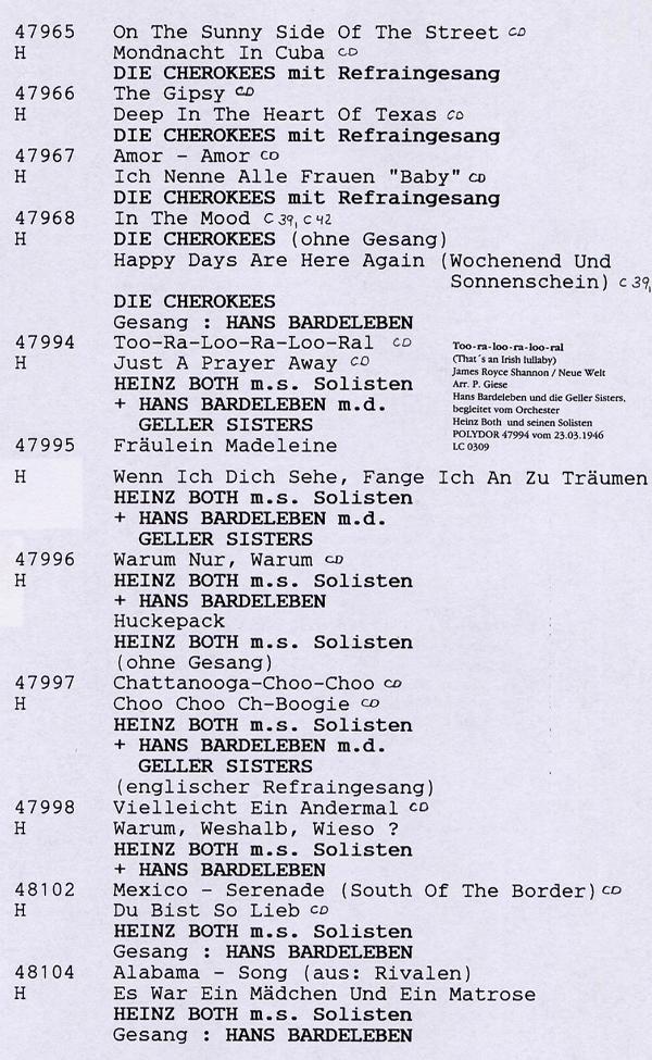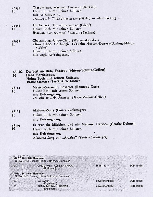 1946 Matinee im GOP in Hannover (HEINZ BOTH-ld, ROLF ROSEMEIER-p, acc, später ROLF LINDNER-p, HERBERT FRITSCHE-v, RUDOLF THEBERATH-v, HANS-GÜNTER PÖPPE-g, arr, FRIEDEL SCHMIDT-b, BERNHARD "BERNI" RABE-1.s, cl, EBERHARD KIRCHNER-2.s, cl, cello, JOACHIM TRESKO-3.s, cl, GEORG ZIMMERMANN-s, cl, GÜNTHER WOLK-tp, EDGAR WESTFAL-tp, HEINZ GÖTZE-tb, HERMANN "MÄNNE" KELLNER-d),
