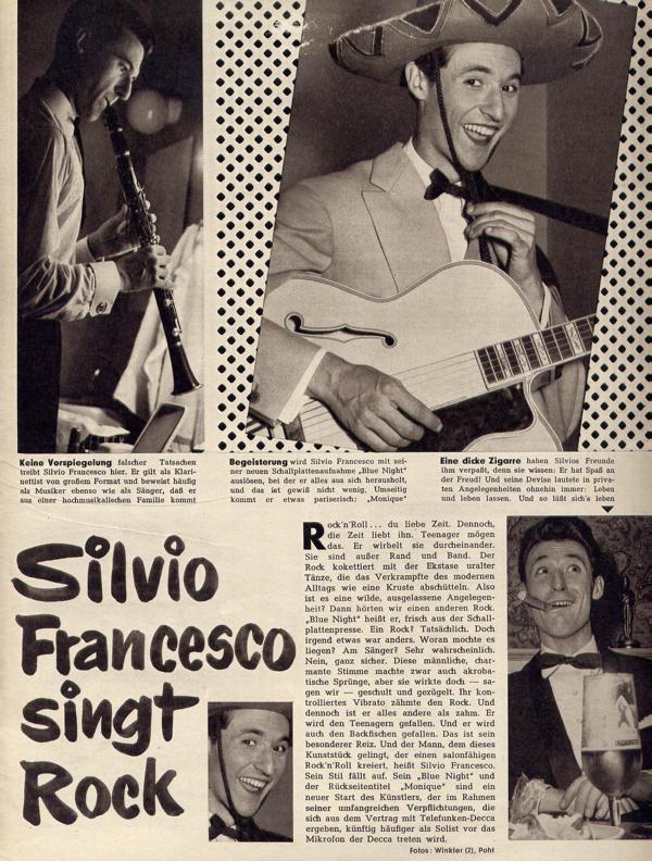 Der Musiker (Klarinette, Gitarre etc.), Tänzer, Schauspieler und Sänger Silvio Francesco wurde am 13. Juli 1927 in Paris, Frankreich, als Silvio Francesco Valente geboren und verstarb am 20. August 2000 in Lugano, Kanton Tessin, Schweiz.