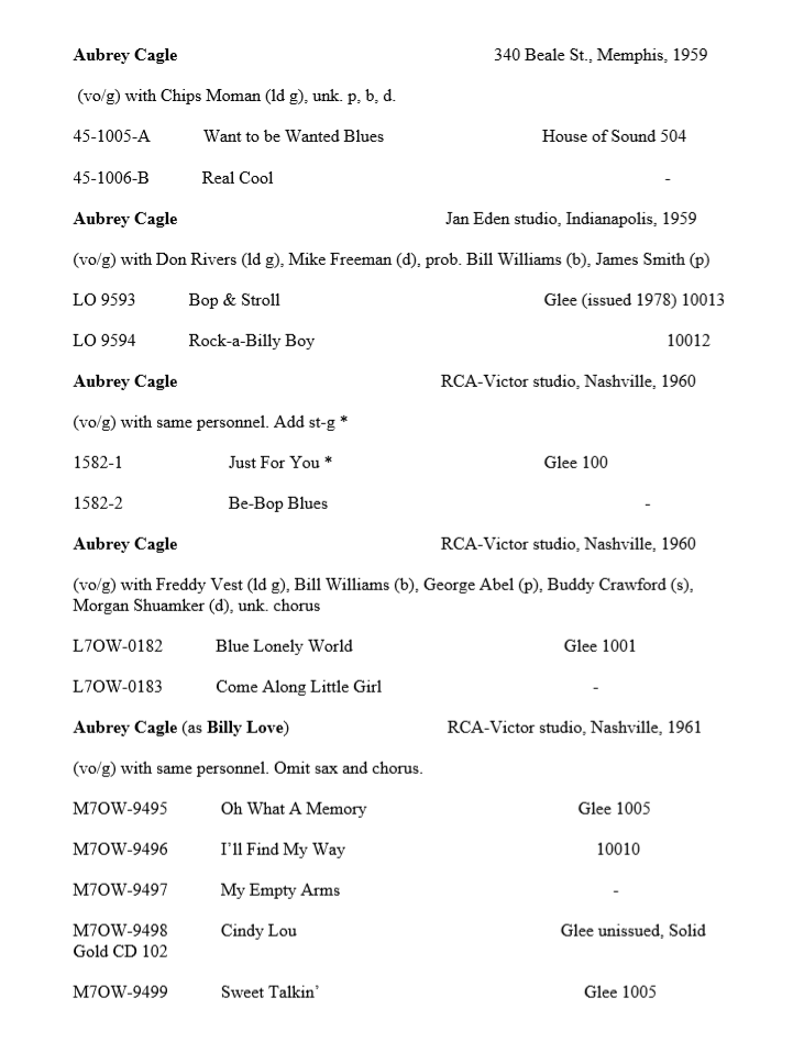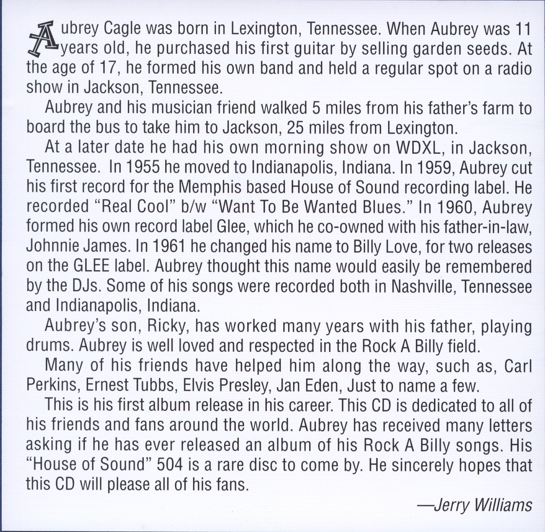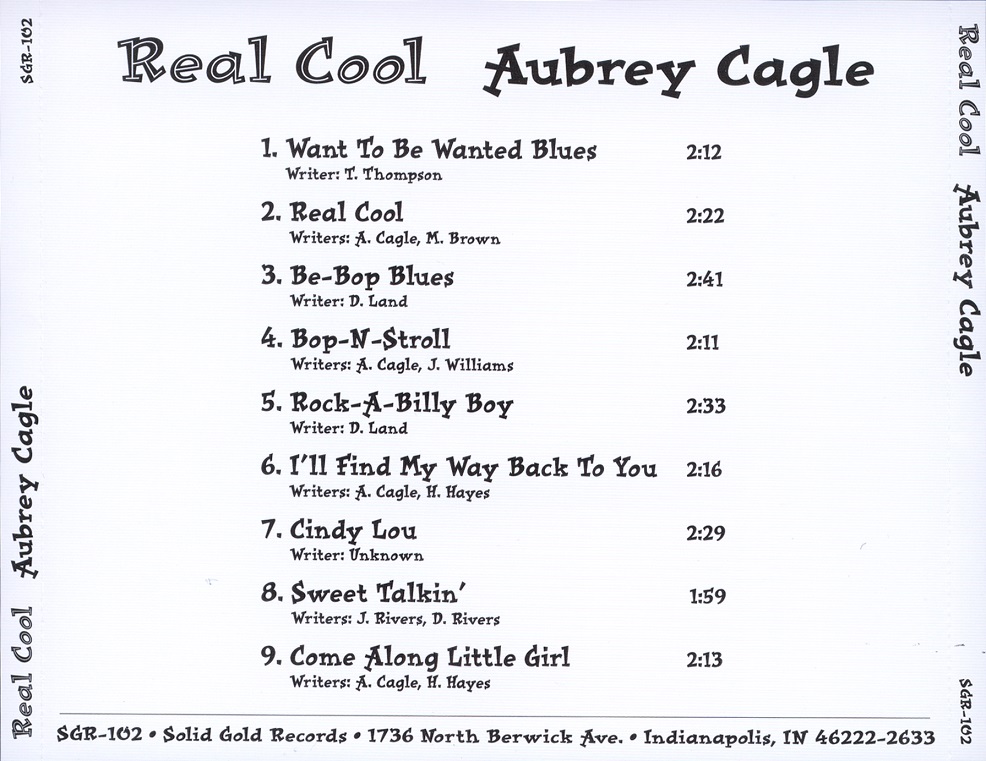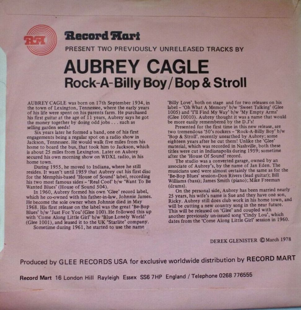 Der Rockabilly-Musiker (Gitarre, Gesang und Autor) Aubrey Cagle wurde am 17. September 1934 in Lexington, Tennessee, geboren und verstarb 2004 in Indianapolis 70-jährig.