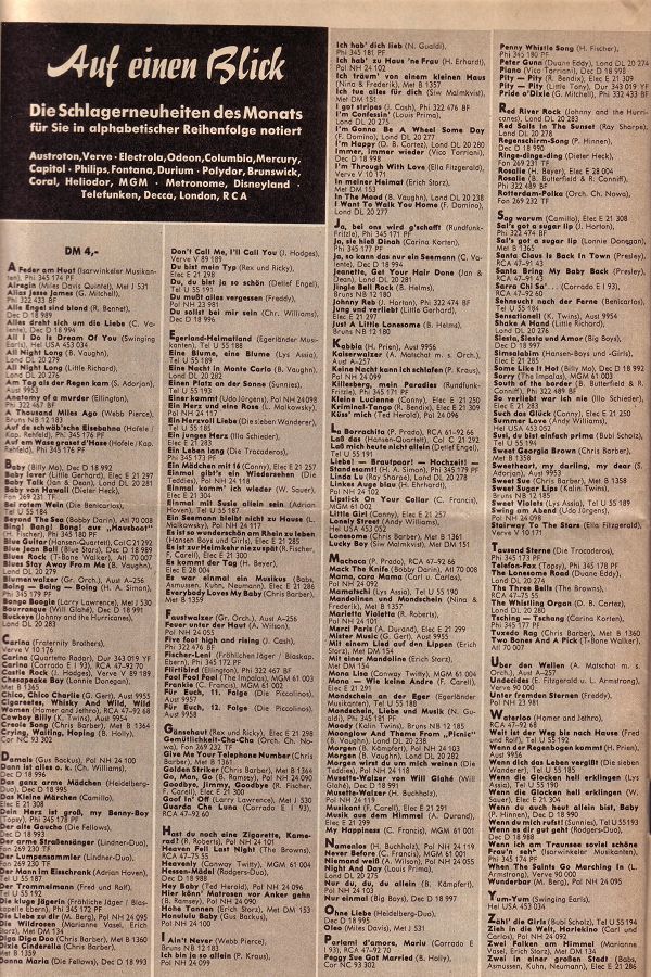 Neben Geschichten über Musik, deren Interpreten und den Ankündigungen diverser Plattenfirmen ist die Seite "Auf einen Blick - Die Schlagerneuheiten des Monats" für uns "Plattenhistoriker" goldeswert
