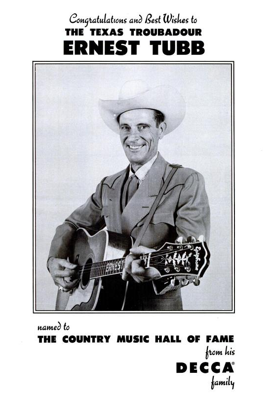 1947 eröffnete er in Nashville auf dem Broadway den ersten und heute noch bestehenden Ernest Tubb Record Shop, der bald berühmt und zu einer Kette ausgebaut wurde. Wenig später initiierte er das Midnight Jamboree, eine wöchentlich im Anschluss an die Grand Ole Opry ausgestrahlte Radiosendung. Sein Sohn Justin Tubb begann 1953 ebenfalls bei Decca als Musiker und konnte sich ebenfalls als erfolgreicher Country-Musiker behaupten. Ein weiterer Höhepunkt seiner Karriere war ein Konzert in der New Yorker Carnegie Hall, der erste Auftritt eines bedeutenden Country-Musikers im „Big Apple“. Hinzu kamen zahlreiche Fernsehauftritte und kleinere Rollen in Spielfilmen. Musikalisch arbeitete er auch mit den Andrews Sisters und Loretta Lynn zusammen. Anfang der sechziger Jahre gelang ihm mit Thanks A Lot erneut ein Top-3-Hit. 1965 wurde er als sechste Person in die Country Music Hall of Fame aufgenommen.
