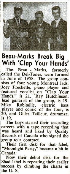 Die Beau-Marks waren eine kanadische Rocknroll-Formation die 1958 in Montreal, Quebec, gegründet wurde. Ihre erste Single wurde im April 1959 noch mit dem Gruppennamen Del-Tones veröffentlicht. Kurz darauf änderten sie als "Verneigung" vor dem Bomarc-Raketenprogramm ihren Namen auf Beau-Marks. Den Durchbruch schafften sie mit "Clap Your Hands", mit dem sie in Kanada und Australien den ersten Platz in den Charts erreichten. Auch in den USA hatten sie einige Charts-Eintritte, bevor sie sich 1963 wieder auflösten.