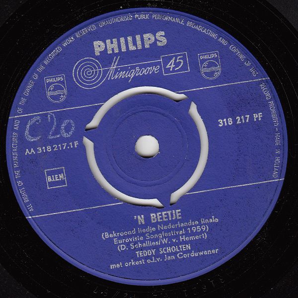 Hier die deutschsprachige Original-Fassung. Die niederländische Fassung von "'n beetje" gab es sowohl mit dem Orchester Jan Corduwener (PHILIPS 318 217) sowie mit dem Orchester Jack Bulterman (PHILIPS 318 229). Ich vermute stark, dass Thorsten uns sagen kann, von welchem Orchester sie beim Song-Contest begleitet wurde