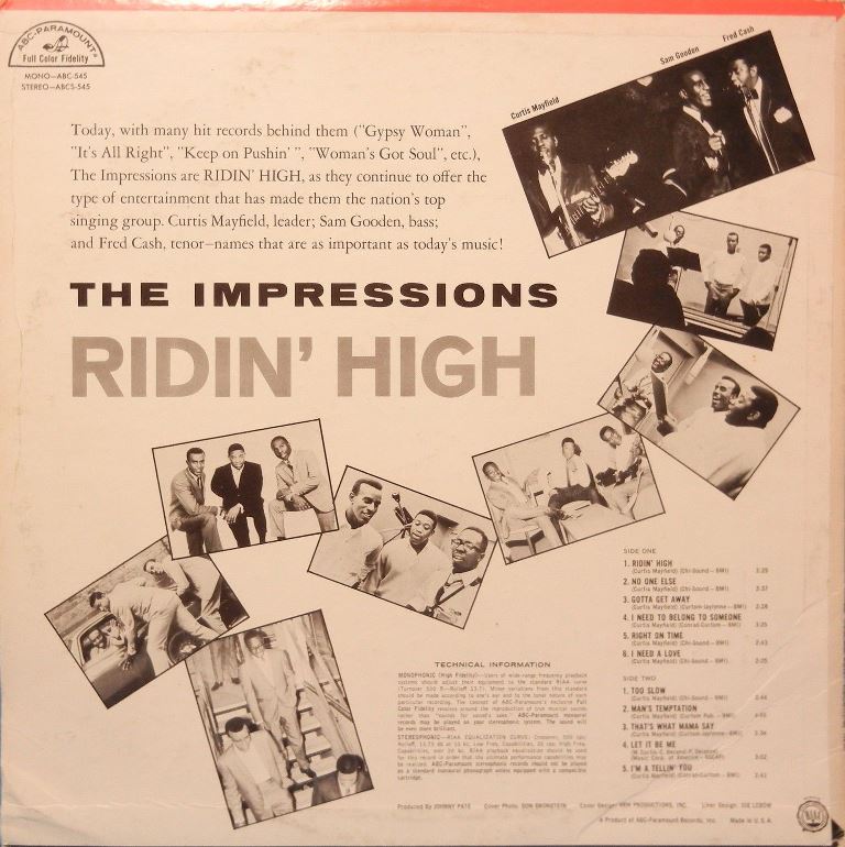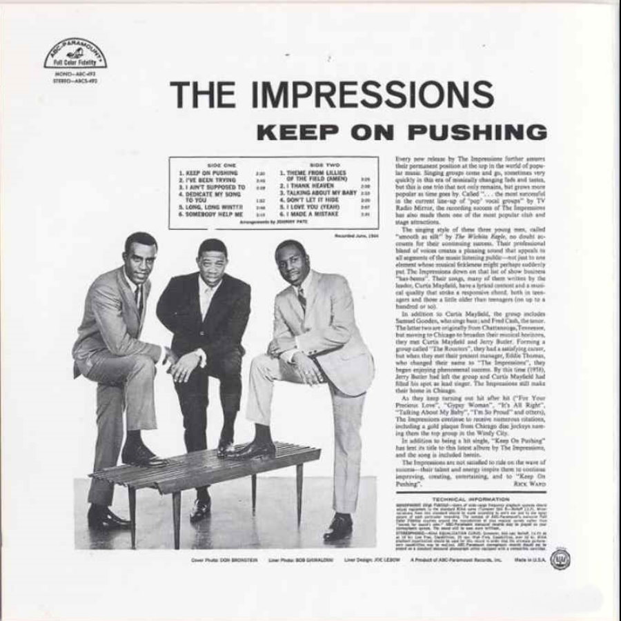1957 in Chicago von Jerry Butler, Curtis Mayfield und den Brüdern Arthur und Richard Brooks unter dem Namen Roosters gegründet war ihr erster Hit "For Your Precious Love" (1958). Die folgenden Aufnahmen des Vokal-Quartetts nutzten weiterhin starke Gospel-Traditionen. Ab etwa 1964 wurde Curtis Mayfield immer mehr zum Komponisten und Schreiber der Hits und integrierte politische Themen. Titel wie "Keep On Pushing" (1964), "People Get Ready" (1965) oder "We're A Winner" (1968) formulierten schwarzes Selbstvertrauen - ein Thema, das Mayfield mit dem Beginn seiner Solokarriere 1970 ins Zentrum seines Songwriting stellen sollte. Nach seinem Abschied von der Gruppe versank diese in der Bedeutungslosigkeit. 1991 wurden sie in die Rock and Roll Hall of Fame aufgenommen und 2003 in die Vocal Group Hall of Fame.