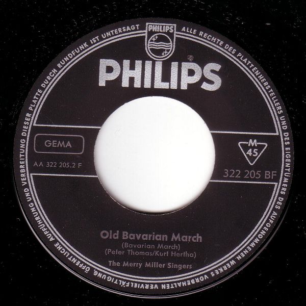 Normalerweise heißt es bei PHILIPS: "Die gleiche Nummer, die gleichen Titeln" aber im folgenden Falle kann man den Spruch "Ausnahmen bestätigen die Regel" mehr als ernst nehmen. Bei der deutschen PHILIPS gibt es nämlich den "River-Kwai-Marsch" auch kombiniert mit dem "Old Bavarian Marsch", das ist aber keine Fehlpressung. Die Rückseite hat tatsächlich die Nummer 322 205 BF sowie AA 322 205.2 F, die Nummer des "Old Bavarian Marsch" war aber 345 656 PF. Damit haben wir auch den Hinweis, dass diese "POLYDOR-Pressung" (mein privater terminus technicus) aus der Zeit nach 1963 stammt