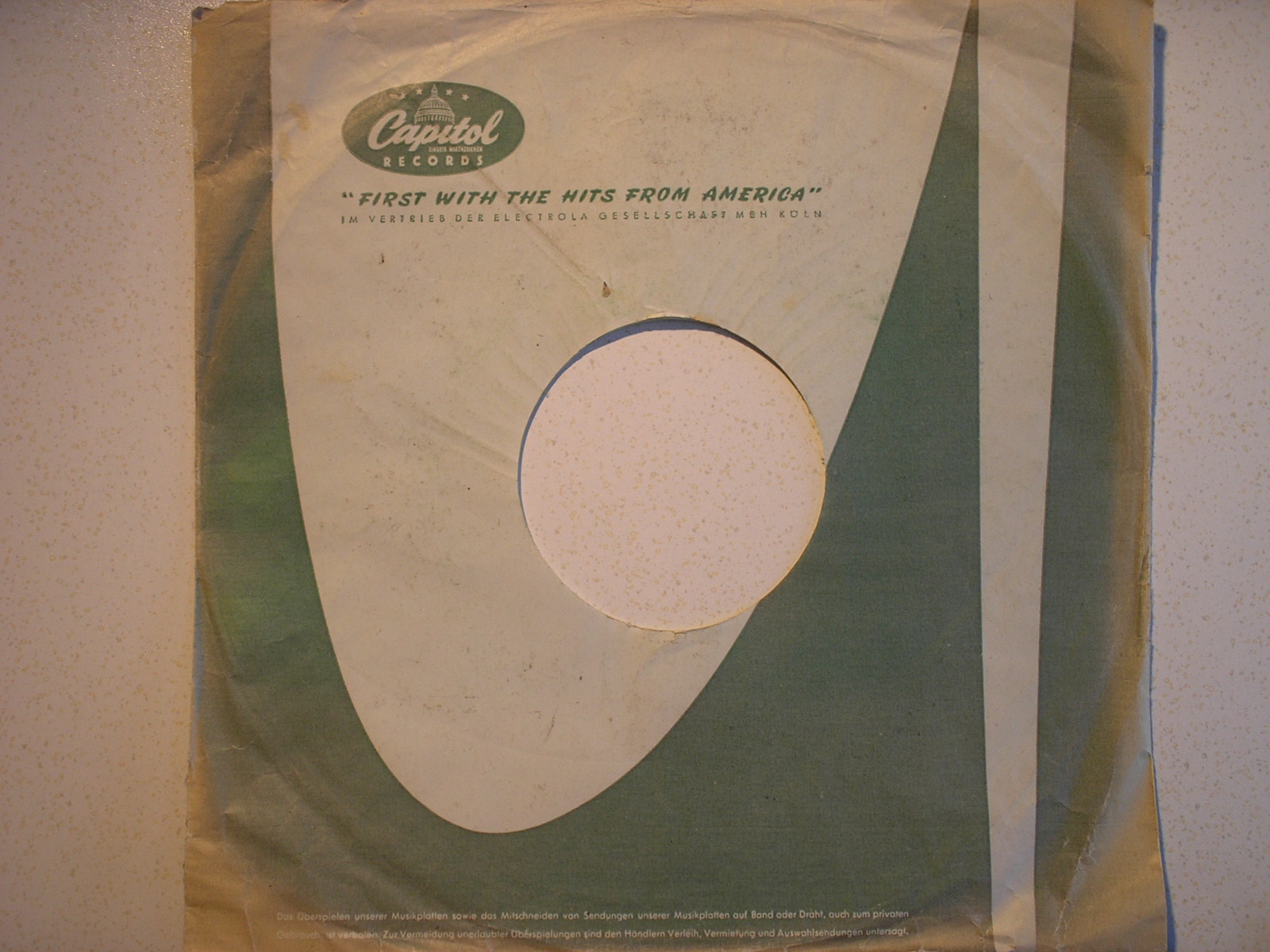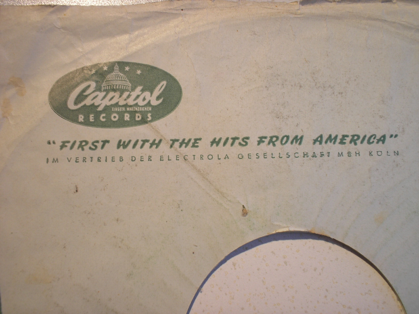 Hier habe ich noch ein Capitol-EMI-Schellackcover für deutsche Presungen. Es mus halt auch aus der Zeit des Firmen-bzw. Rechtewechsels von TELEFUNKEN an EMI erschienen sein. Als 45-ger Cover doch recht häufig zu finden, allerdings als 78-ger Covervariante schon seltener.