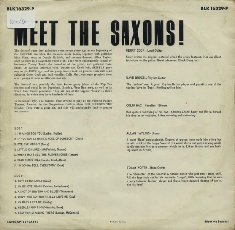 Die anderen "Saxons" gab es bereits früher und die dürften auch nur eine Veröffentlichung im Jahre 1963 gehabt haben, allerdings als LP ACE OF CLUBS ACL 1173 (bei uns 1964 als DECCA BLK 16329-P). Verwirrend ist, dass auch diese Saxons im Netz sehr oft mit Joe Meek in Verbindung gebracht werden, was ich eher für eine Verwechslung halte. Vielleicht hatte aber Joe Meek zwei "Saxons", wer weiß?