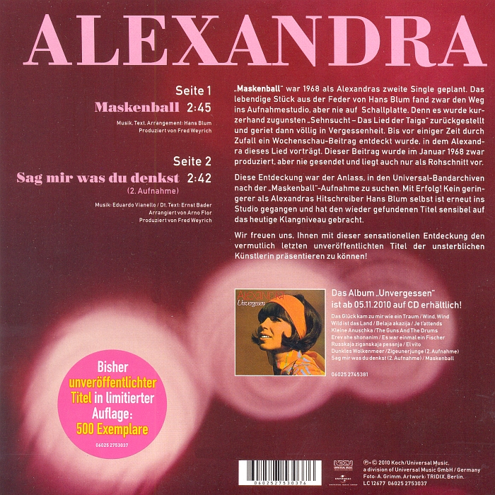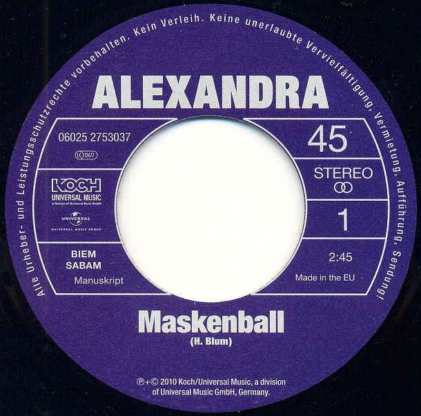 "Maskenball" ist ein bisher unveröffentlichtes Lied, das eigentlich die zweite Single von Alexandra in 1968 werden sollte. Die ganze Story steht gut lesbar auf der Coverrückseite (siehe Scan).