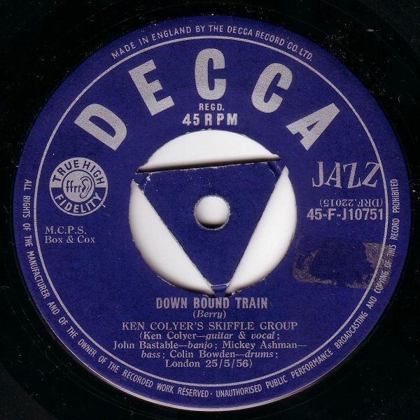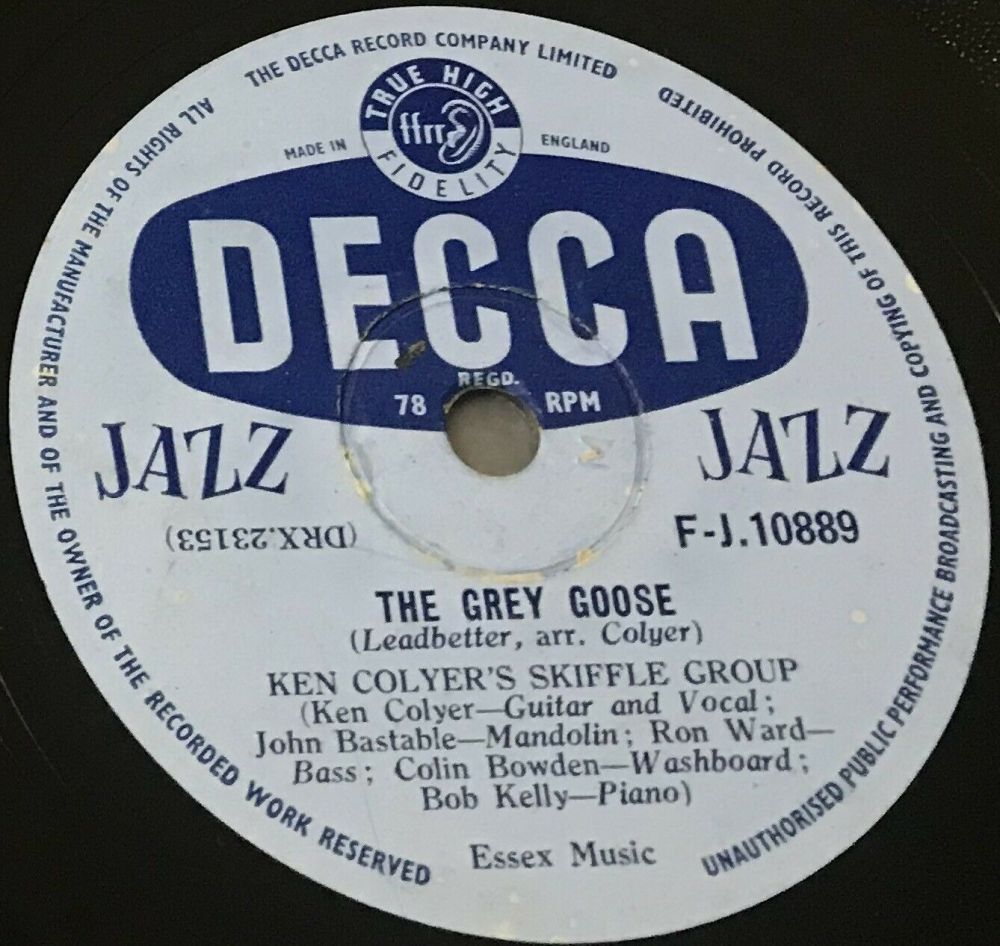 ?? 58....D 18 752....Ken Colyer's Skiffle Group Ken Colyer, guitar and vocal; John Bastable, banjo; Ron Ward, bass; Colin Bowden, washboard; Bob Kelly, piano..Gow Down Sunshine/Ella Speed (UK: DECCA 10972)