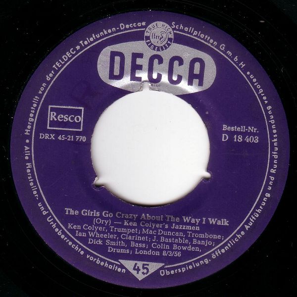 01 57....D 18 403....Ken Colyer's Jazzmen KenColyer, Trumpet; Mac Duncan, Trombone; Ian Wheeler, Clarinet; J. Bastable, Banjo; Dick Smith, Bass; Colin Bowden, Drums; London 8/3/56..Dippermouth Blues/The Girls Go Crazy About The Way I Walk (UK: DECCA 10755)