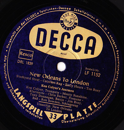 11 55....D 18 133....Ken Colyer's Jazzmen Ken Colyer (ts) Monty Sunshine (cl) - Chris Barber (tb) - Tony Donnegan (bjo) - Jim Bray (b) - Ron Bowden (dm)..Early Hours/Cataract Rag (UK: DECCA 10504)