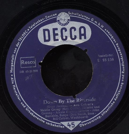 06 57....D 18 449....KEN COLYER'S SKIFFLE GROUP Ken Coyler, g and vo - Alexis Korner, g John Bastable, bjo - Dick Smith, b Bill Colyer, wb..Go Down Old Hannah/Streamline Train (UK: DECCA 10711)