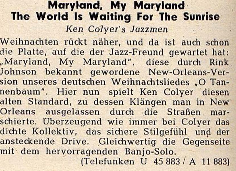11 56....U 45 883....Ken Colyer's Jazzmen..Maryland, My Maryland/The World Is Waiting For The Sunrise (UK: TEMPO 136)
