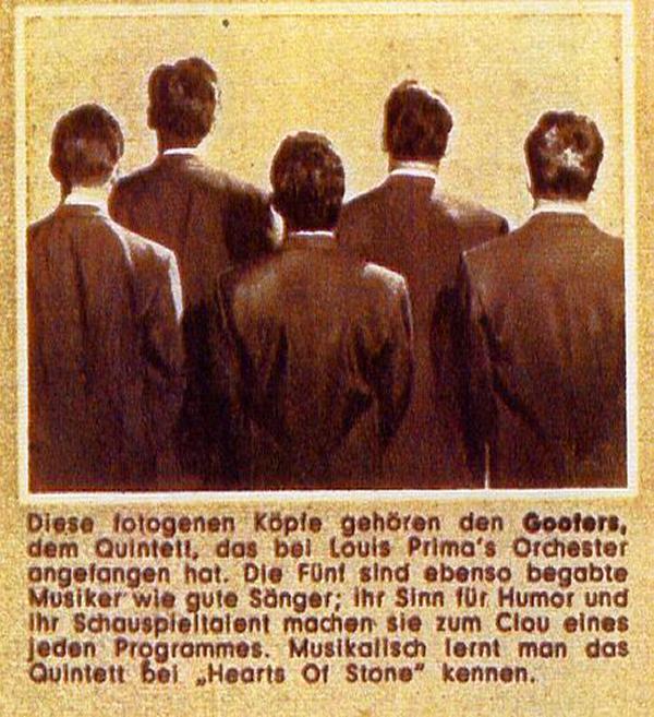 Leider konnte ich über die Goofers weder die Namen der Gruppenmitglieder noch sonst irgendetwas herausbekommen. Musikalisch würde ich sie der Rhythm & Blues-Kategorie des Rocknroll zuordnen, obwohl die Stimmen für mich eher weiß klingen, aber da kann man sich gewaltig irren. Da ich eher der Rockabilly-Kategorie des Rocknroll zuzuordnen bin, sind sie nicht unbedingt mein Geschmack, aber ins Forum gehören sie auf jeden Fall und da fehlten sie bisher noch.