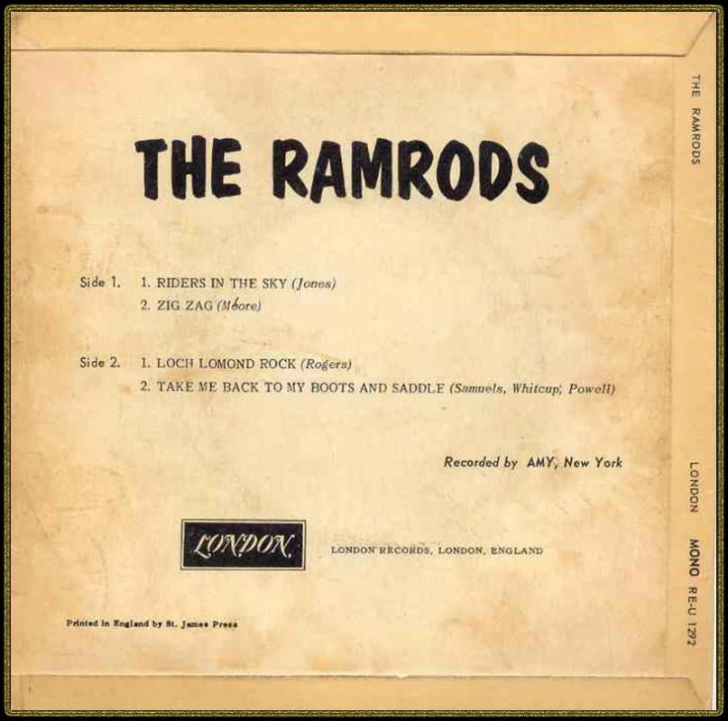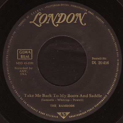| Information: | RAMRODS LONDON DL 20 416 A1: LOCH LOMOND ROCK (ROGERS) B1: TAKE ME BACK TO MY BOOTS AND SADDLE (SAMUELS - WHITCUP - POWELL) |