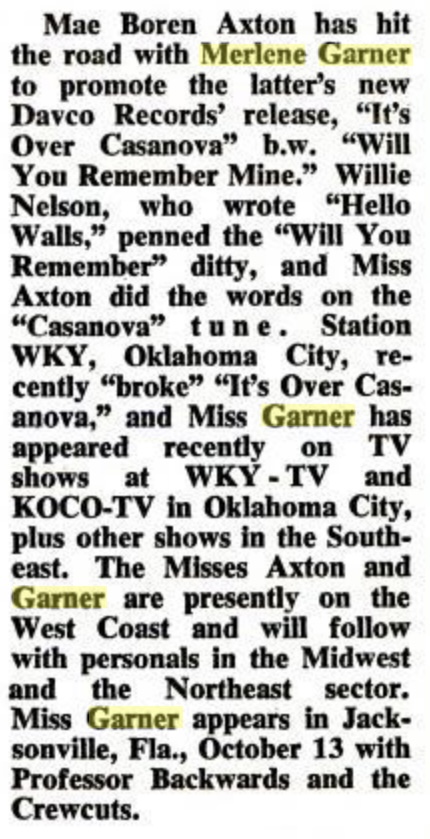 12 61....DR-106....MERLENE GARNER..Will You Remember Mine (M80W 8159)/(It's Over) Casanova (M80W 8160)