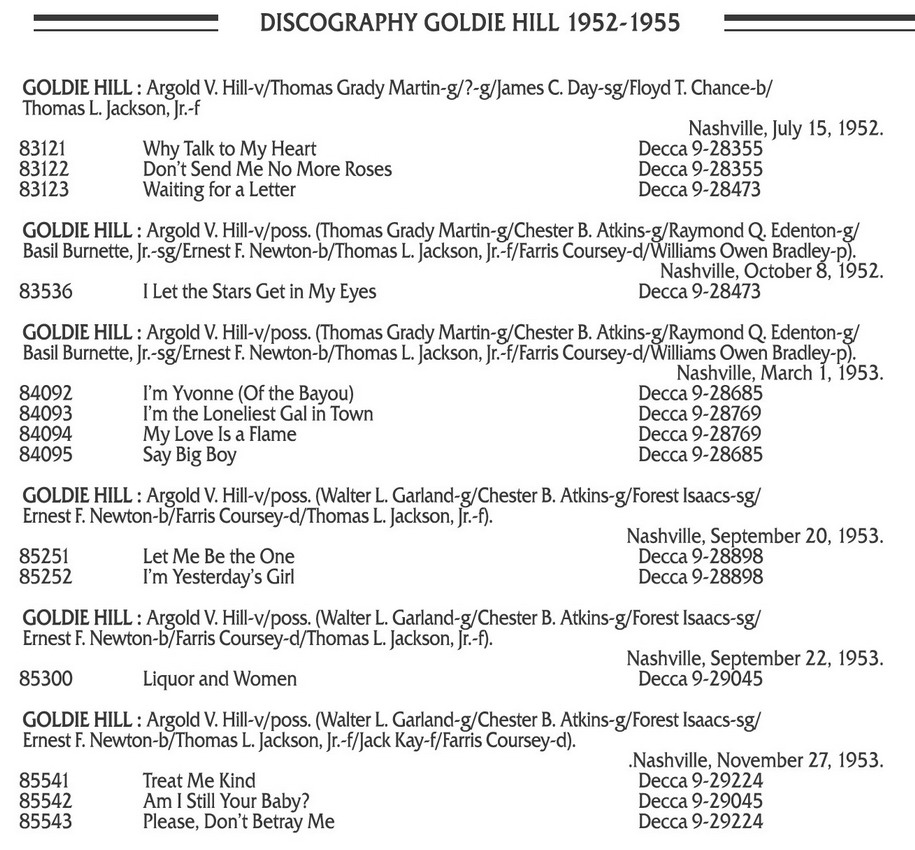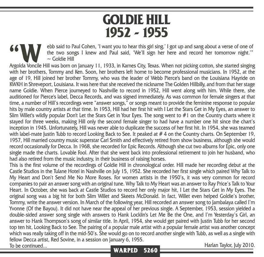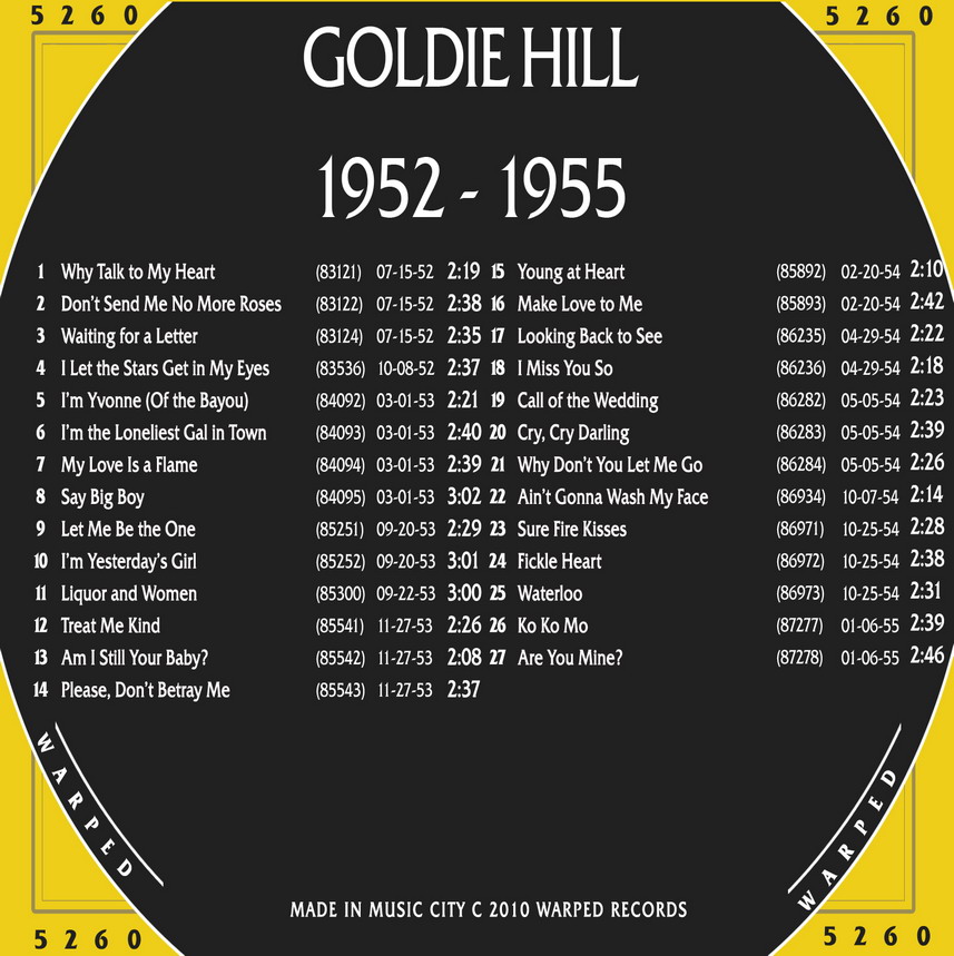 Die Country-Sängerin Goldie Hill wurde am 11. Jänner 1933 in Coy City, Texas, als Argolda Voncile Hill geboren und verstarb am 24. Februar 2005 in Nashville, Tennessee, nach längerem Kampf gegen den Krebs.