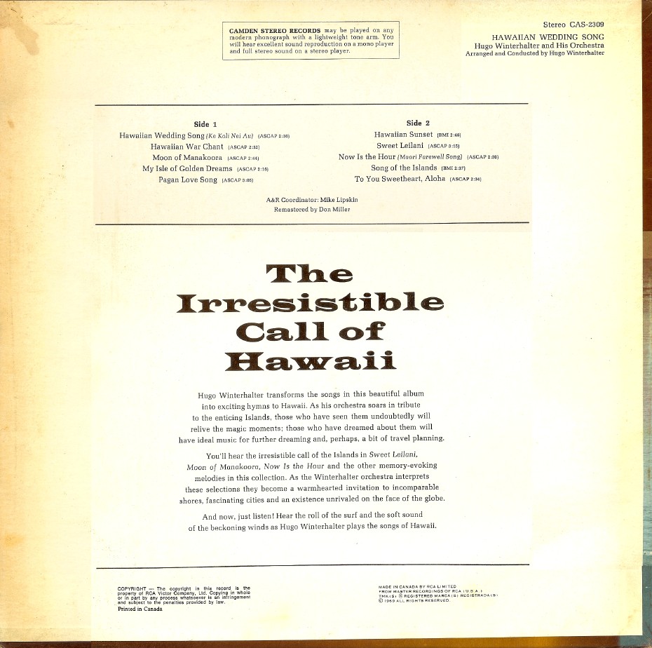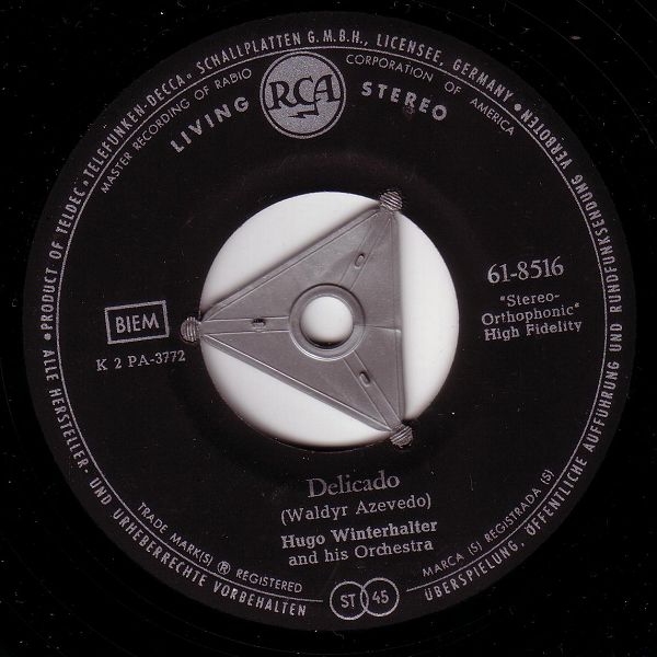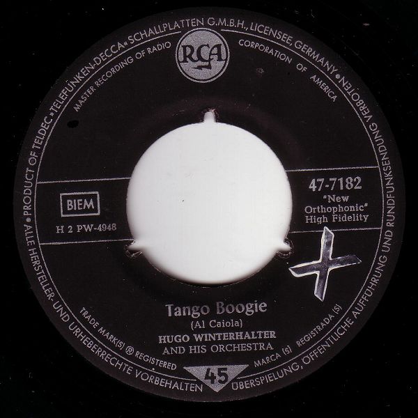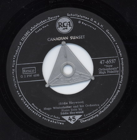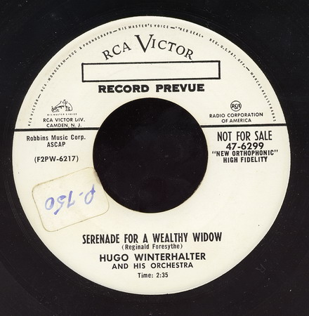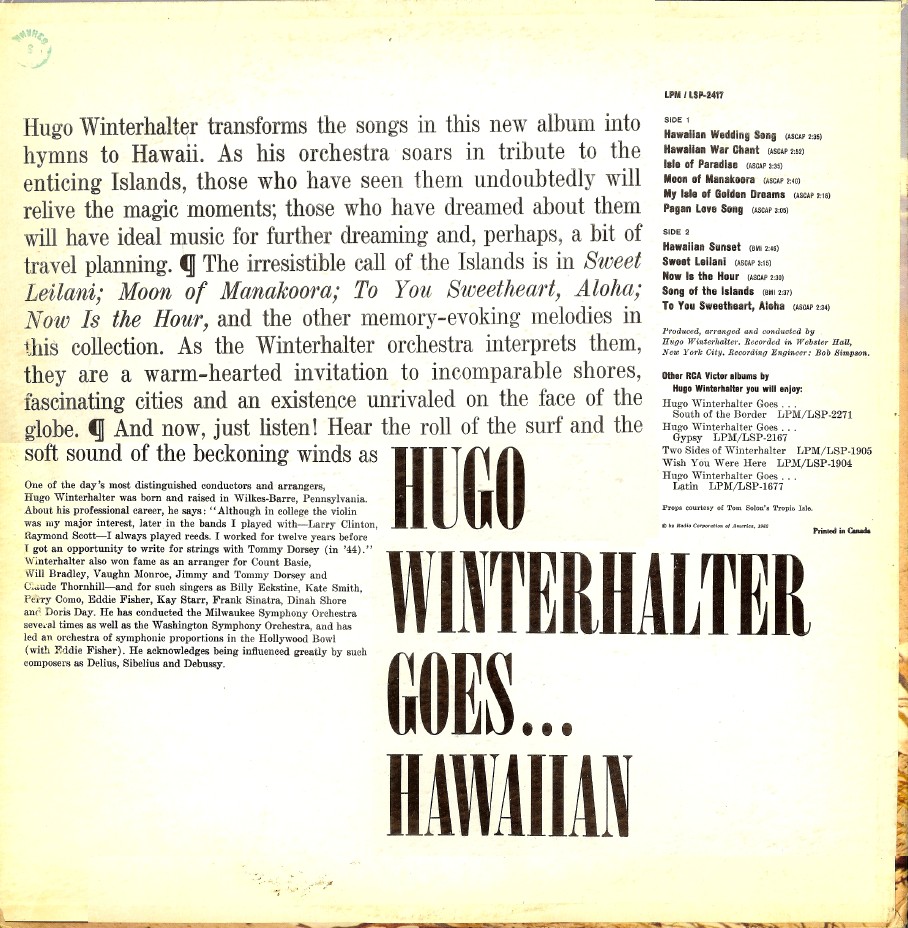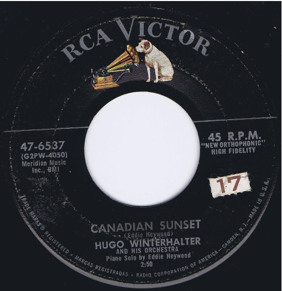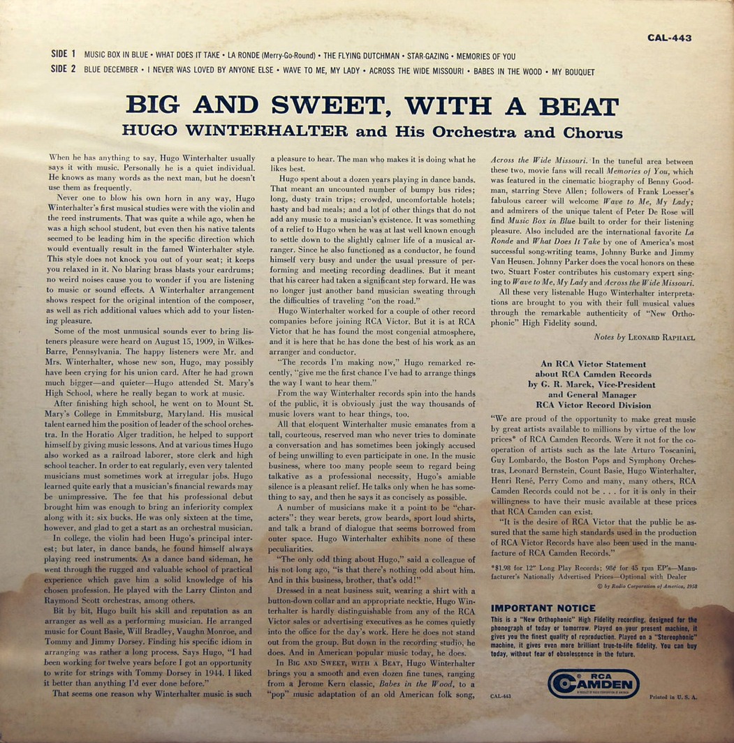 In den frühen 50er Jahren avancierte er dann bis 1963 zum chief musical director bei RCA Victor. Dort war er maßgeblich für den Sound der Hits verschiedener Künstler wie Eddy Arnold (1955 “Cattle Call“ # 1), Perry Como, Kay Starr (1955 “The Rock And Roll Waltz“ # 1, 1956 # 1 in der britischen Hitparade), Eddie Fisher (1956 “Oh! My Papa“ # 1), Jaye P. Morgan oder The Ames Brothers (1954 “The Naughty Lady Of Shady Lane“ # 1) verantwortlich. Hier tat er sich aber nicht nur als Arrangeur für andere Interpreten hervor, sondern brachte seit 1949 Schallplatten als Hugo Winterhalter orchestra heraus. Dabei vermischte er den Big Band-Einfluss mit seiner Liebe zu leichter klassischer Musik und entwickelte im Ergebnis eine Art Easy Listening-Music.