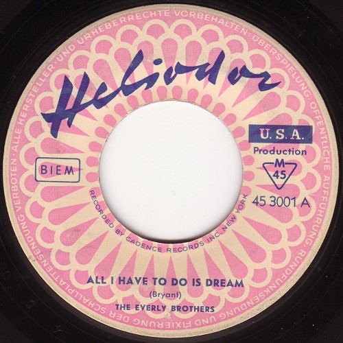 Original-Label: Cadence 1348, deutsche Matritzenherstellung F 8 ( Juni/1958), Composer von A : “Boudleaux Bryant” und B : “Roy Orbison”, deutsche Platte auf rosa Label, Placierung Hitparade in den USA: “All I have To Do Is Dream” 4/58, #1 pop, #1 country, #1 r&b, reissue # 96 pop und “Claudette” 5/58, #30 pop, #15 country