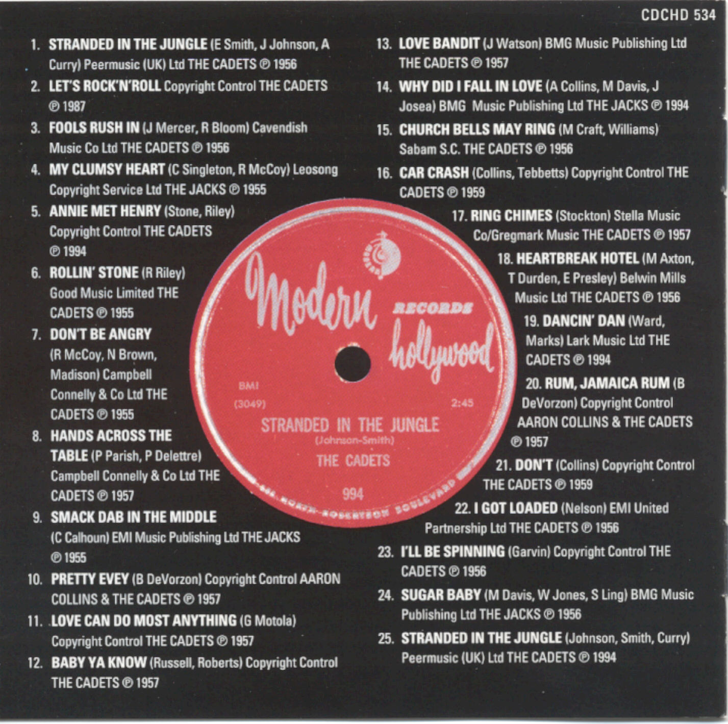 Die erste Schallplatte der Cadets erschien bereits noch im April 1955 auf Modern. Es war eine Cover-Version des Nappy Brown-Originals “Don’t Be Angry“ und noch im selben Monat nahmen sie einen Titel von The Feathers auf, “Why Don’t You Write Me“ mit Willie Davis als Lead-Sänger. Das Original war auf Showtime Records erschienen. Damit sich nicht beide Titel der Cadets gegenseitig Konkurrenz machen sollten, erschien der Titel “Why Don’t You Write Me“ unter dem Namen der Jacks auf dem Tochter-Label RPM. Da die Jacks prima einschlugen und einen vorderen Rang in der R&B-Charts erreichten, wurde die Praxis zukünftig weiterbetrieben: The Cadets erschienen auf Modern Records und Titel unter dem Namen The Jacks firmierten auf RPM Records. Ende 1955 schied Lloyd McCraw aus und wurde durch Thomas "Pete" Fox ersetzt. Dieser kam von The Flairs. Lloyd McCraw (+ 1987) gründete später eigene Label wie M.J.C.- oder Titanic Records. Dub Jones und Aaron Collins wurde seine Partner. Im Frühjahr verließ Ted Taylor (* 16. Februar 1934, + 02. Oktober 1987) die Gruppe und plante eine Solo-Karriere.Nach der “Stranded By The Jungle“-Aufnahme recordeten sie nur noch zu viert: Willie Davis (+ 2011), Aaron Collins (+ 1997), Pete Fox und Dub Jones Peter Fox setzte später seine Aktivitäten als Gitarrist und Gitarren-Lehrer fort.