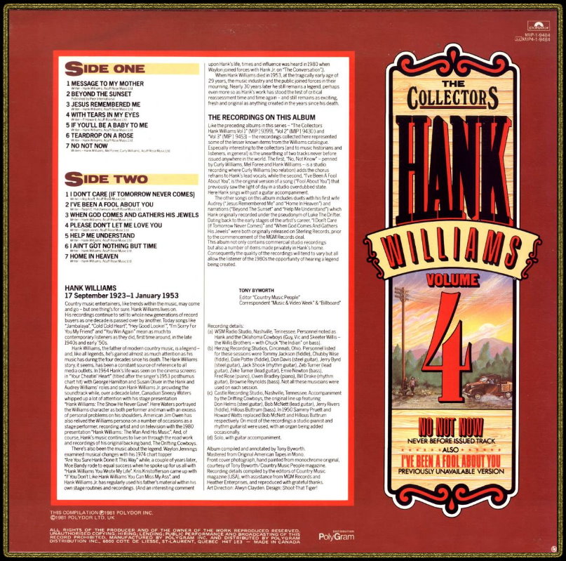 1999 veröffentlichte Mercury Records in Nashville ein 10 teiliges CD-Set “The Complete Hank Williams“, das alles enthält, was es von Hank Williams zu hören gibt.