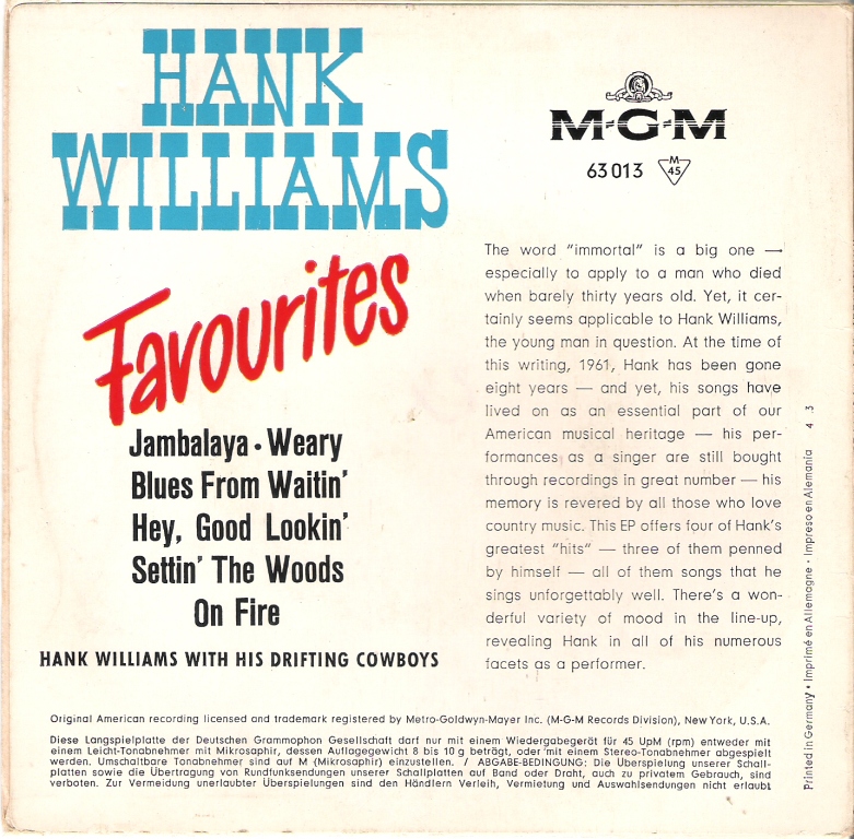 In Deutschland ist der Name Hank Williams besonders den Kennern der Country Musik-Szene vorbehalten. Aber seine Lieder sind auch in deutschen Landen bekannt, ohne oftmals zu wissen, wer hinter den Kompositionen und Original-Interpretationen steht. Neben seinem in Deutschland bekanntesten Titel “Jambalaya“ standen auch weitere seiner Songs Pate für mehr oder weniger bekannte deutsche Cover-Versionen: