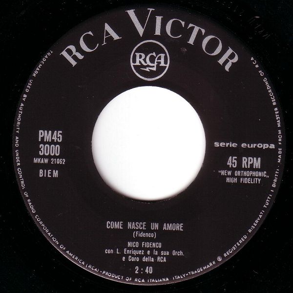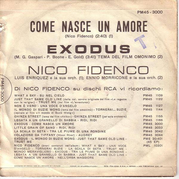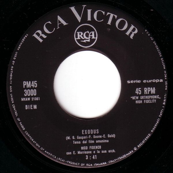 10 61....PM45 3000....NINO FIDENCO con E. Morricone e la sua orch. ..Exodus (MKAW 21061)/NICO FIDENCO con L. Enriquez e la sua Orch. e Coro della RCA..Come nasce un amore (MKAW 21062)