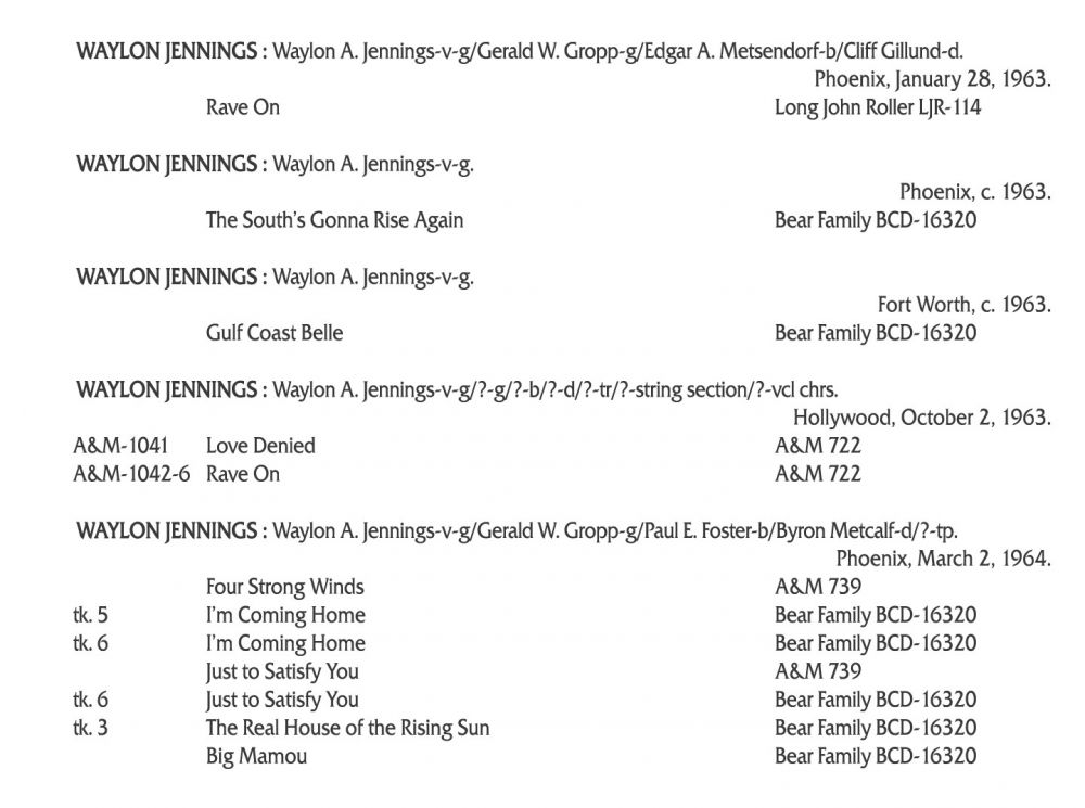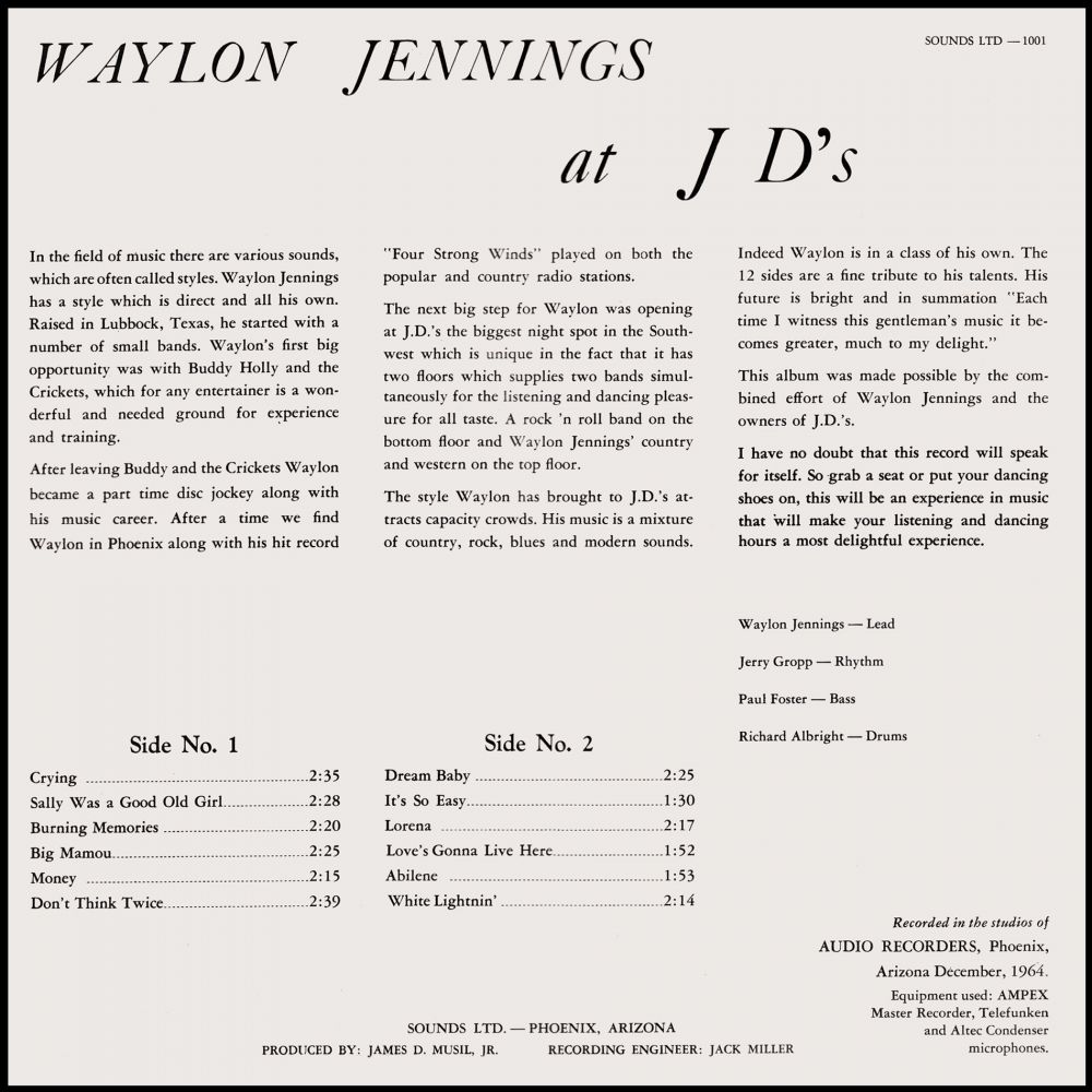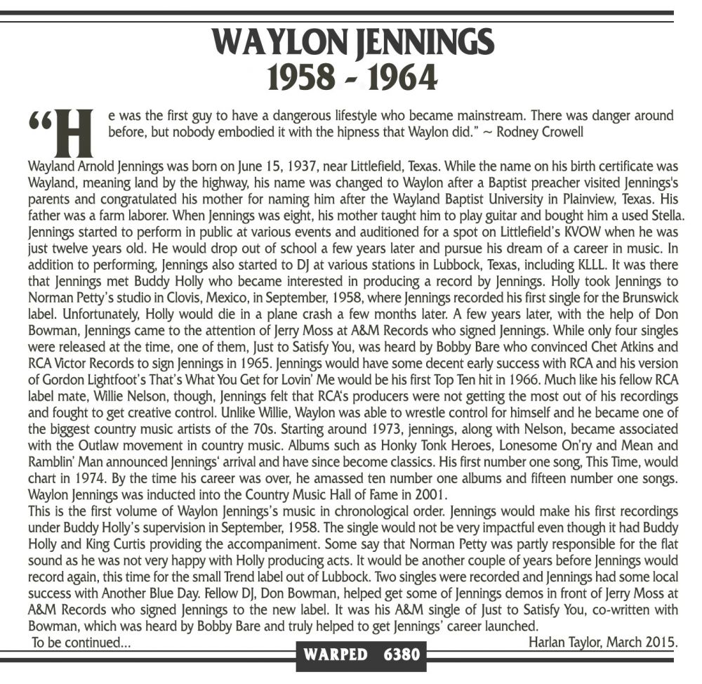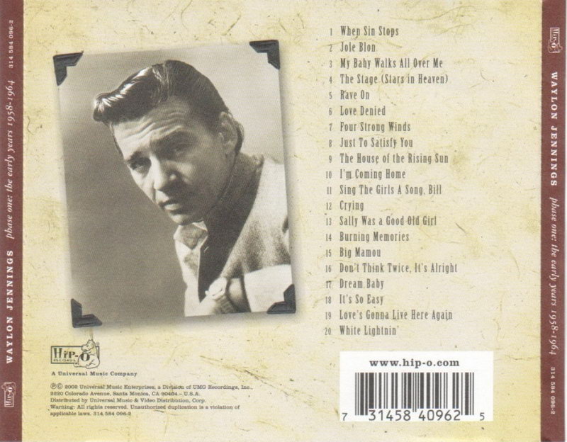 Der Countrysänger und Musiker Waylon Jennings wurde am 15. Juni 1937 in Littlefield, Texas, als Waylond Arnold Jennings geboren und verstarb am 13. Februar 2002 in Chandler, Arizona. Von seiner Mutter erlernte er sehr früh das Gitarrenspiel aber seine musikalische Karriere begann er vorerst als Disc-Jockey bei diversen Radiosendern. 1958 lernte er Buddy Holly kennen der ihn als Bassist in seine Band aufnahm (von den Crickets hatte er sich bereits getrennt) und ihn noch zusätzlich förderte, indem er seine erste Plattenaufnahme produzierte.