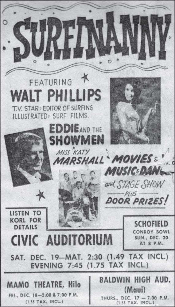 “I considered Eddie and The Showmen to be a ‘surf band.’ In fact, one of the songs I wrote, ‘Toes on the Nose,’ with the ascending guitar lines, I visualized as I walked to the nose of the board. I thank John Severson for the song title as it was one of the sections in Surfer Magazine.